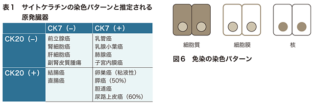 その辺りまで考えたところで,免染をオーダーして鑑別疾患をより絞り込むことになる.何か特別の組織が想起される場合(たとえば,肺癌ならTTF-1,Napsinなど,前立腺癌ならPSA,乳癌ならER,PRなど)はそれとともに,そして大きくスクリーニング的にも利用されるのが分子量の異なるサイトケラチン(cytokeratin:CK)の組み合わせで,通常はCK7とCK20が頻用されている(図5).