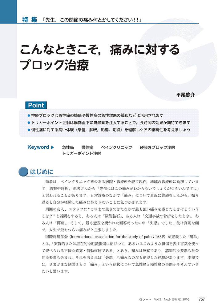 患者さんの訴える痛み・しびれは診療の現場では,われわれ医療者と患者さんのコミュニケーションツールとなります.決して体験することのできない他人の痛みやしびれという感覚を通じて,出会った両者が何とか折り合いをつけてその関係性から患者さんたちが飛び立っていけるように,そんな「BIO-PSYCHO-FAMILY-SOCIAL」な視点でサポートするのが総合診療医の役目だろうと思います.