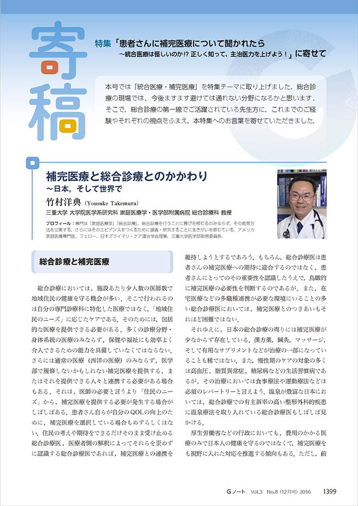 今回の特集では,統合医療や補完医療を取り扱いますが,補完医療の効果の有無についての検証を目的としていません.現に多くの患者さんに利用されている補完医療の現状を少しでも理解できるように,そして,そんな補完医療を利用している患者さんを担当する場合に,われわれがどのように対応し,補完医療提供者と連携していけばよいのか,手がかりとなるような内容をめざしました.