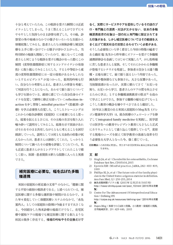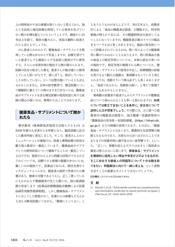 読者の先生方も,過去に1人や2人は「どうして理解してもらえないのか」と,もどかしく感じる患者さんを担当したことがあると思います.補完医療に傾倒した患者さんの価値観を尊重しつつ,医師の責務を果たすのは非常に難しいことです.われわれ医師は,補完医療を否定したり知らぬ存ぜぬで不関知を貫くことで,責任回避,保身的になっていることはないでしょうか.