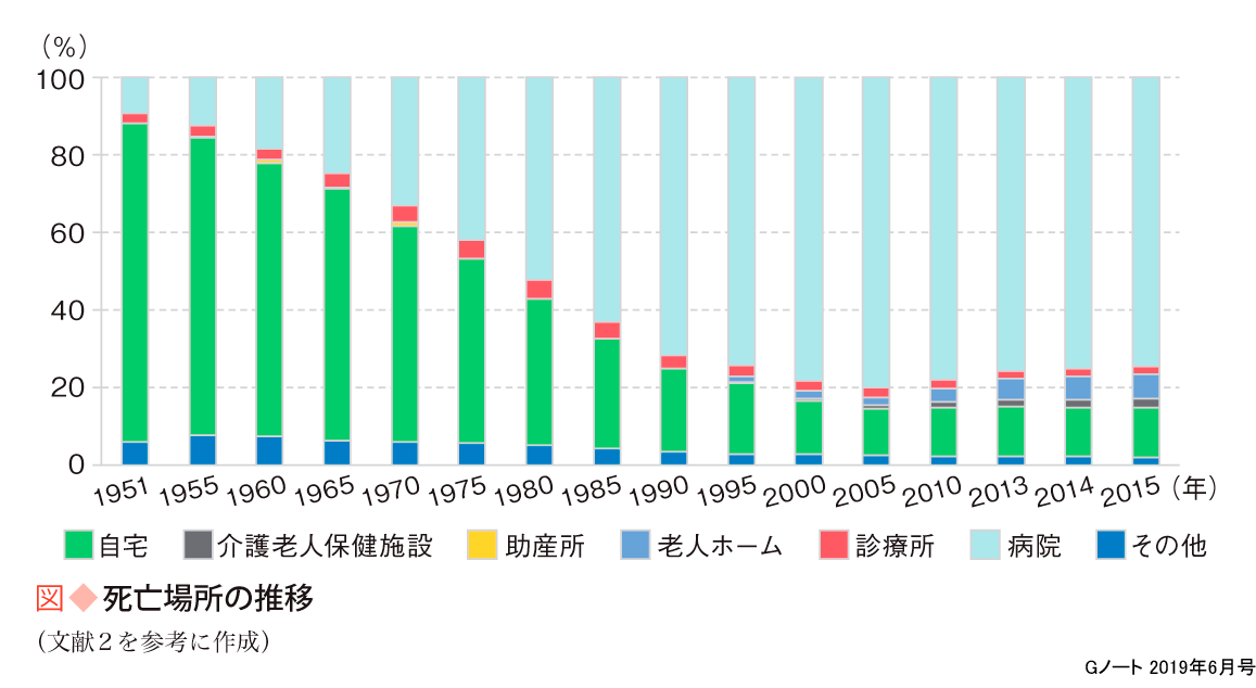 その後2005年頃まで自宅で亡くなられる方は減少し,医療機関で亡くなられる方が増加する傾向にありました.