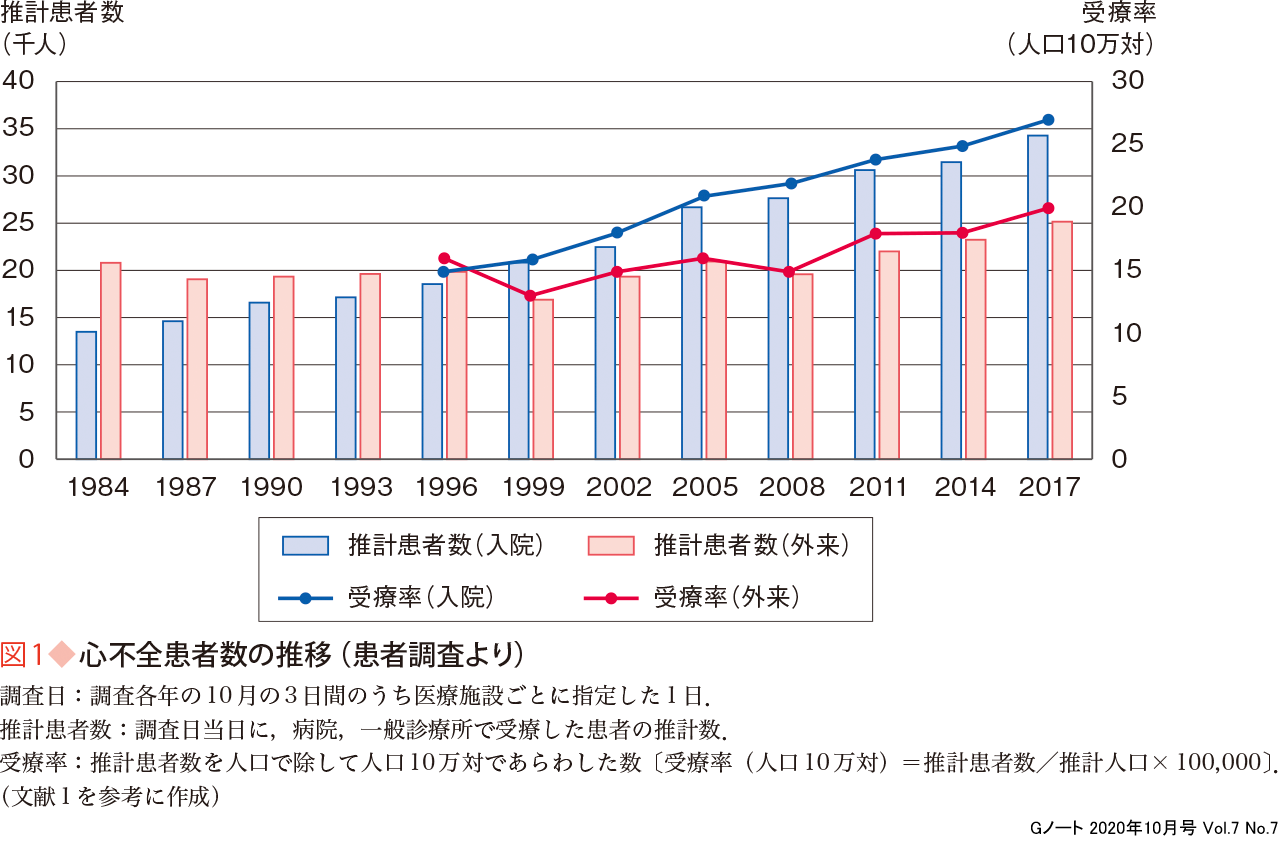 まず今の心不全診療の現状について,マクロな視点でご説明します.厚生労働省は3年ごとに患者調査を行っています.それを示したのが図1の心不全患者数の推移です1).