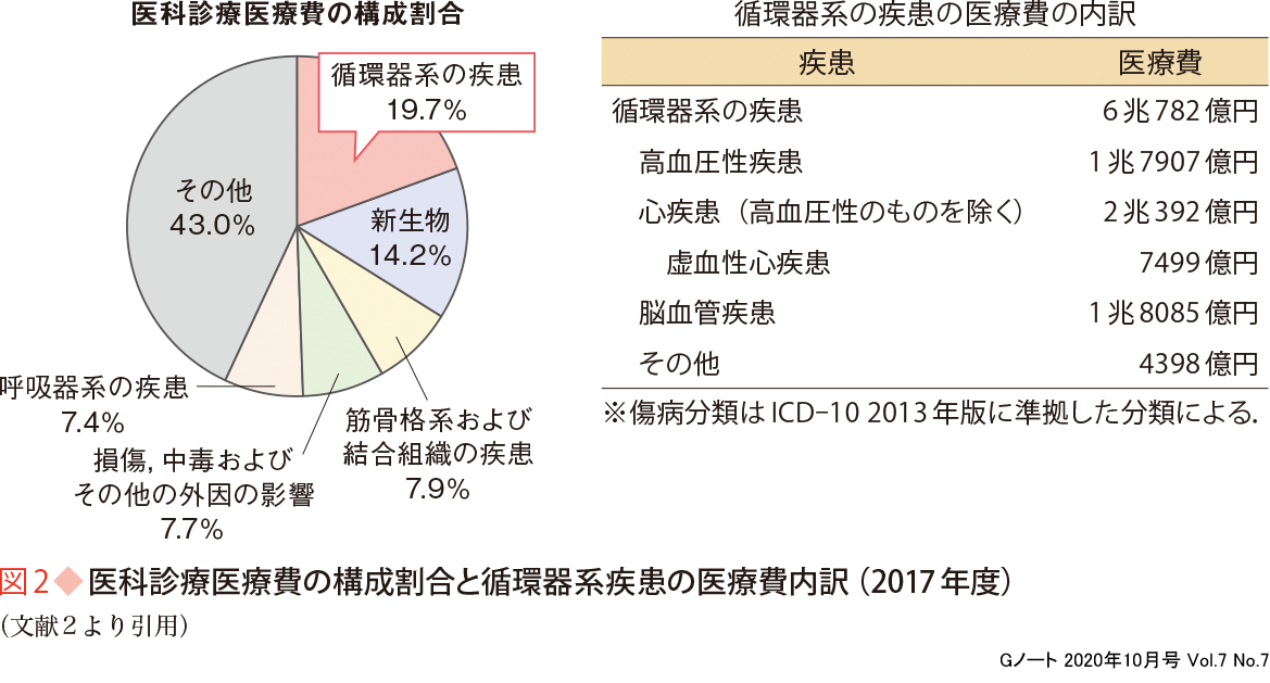 厚生労働省の資料2)によると,2017年度(平成29年度)の傷病分類別医科診療医療費は,30兆8,335億円でした.そのうち,循環器系の疾患(循環器病)が占める割合は,6兆782億円(19.7%)と最多でした.なかでも心疾患だけで2兆392億円と大きな割合を占めています(図2)2).