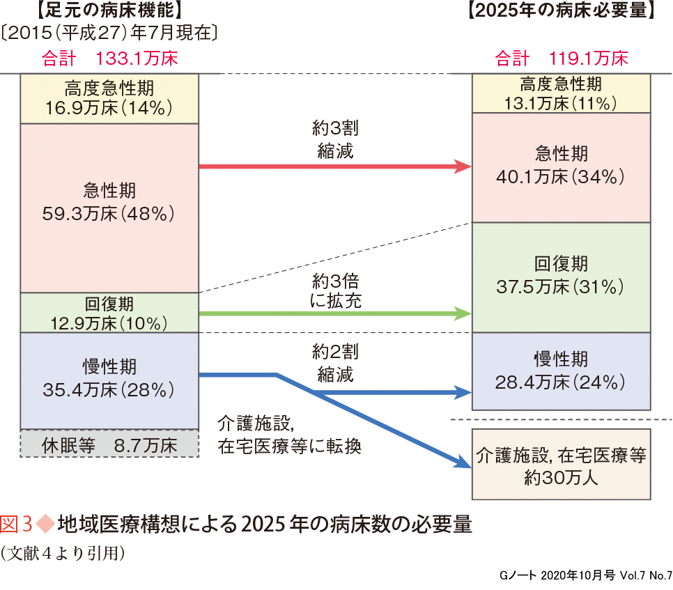 なぜ心不全ではこれだけ医療費がかかるのでしょう.スペインからの報告では,心不全の医療費を逼迫している最大の要因は再入院3)だと指摘されています.やはり入院というのはそれだけ医療資源を使うものだということなんですね.ここで病床数の話に戻りますが,病床数と入院医療費には正の相関があると指摘されています.病院は病床が空いていると赤字になるため,本来介護で対応すべきような患者を社会的入院などと称して入院させ,病床をうめることで病院側が医療費を賄ってしまうためだといわれています.現在社会保障費は増加の一途をたどっており,今後も持続可能な社会をつくるためには医療費の縮減は国家命題です.そのため,地域医療構想で急性期病床・慢性期病床を約2〜3割縮減する方針を打ち出しています.それを示したものが図3です4).