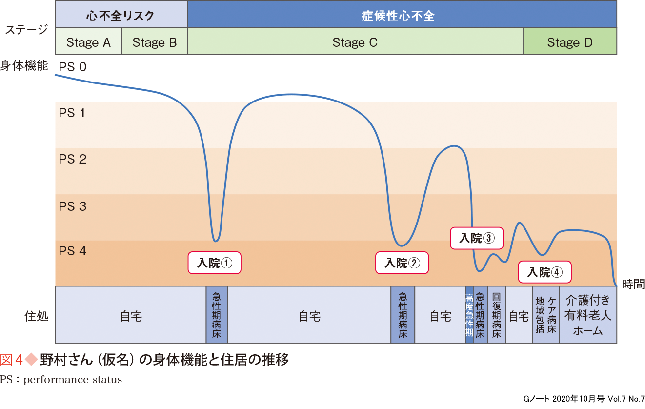 そのまま自宅での治療を希望されていたが,心不全が悪くなるにつれ医療・介護の必要量が急速に増したため地域包括ケア病床に入院した(図4④).早期治療が功を奏し状態は改善したが,家族の疲労や介護の手間が今後も増えることを想定し,これを機に介護付き有料老人ホームに入居した.施設では訪問看護やデイケア,食事調整などを行って再増悪せず生活できた.1年ほど経って,再び心不全増悪の兆候がみられたが施設で過ごすことを希望され,症状緩和中心の治療・ケアをうけ,その後お看取りとなった.