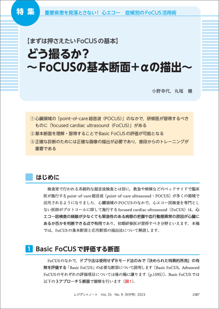 現代の医療では,多くの診療科で超音波検査が利用されています.従来,超音波検査といえば検査室まで患者さんに来ていただいて施行されることが多かったのですが,近年ポータブルな小型の超音波診断装置が開発されたことも相まって,診察室やベッドサイドで身体診察の一環として施行する検査,point-of-care超音波(point-of-care ultrasound:POCUS)が活用されるようになっています.…