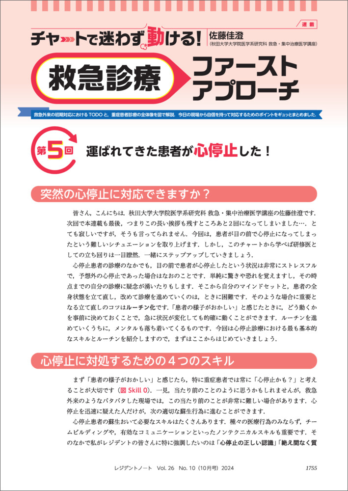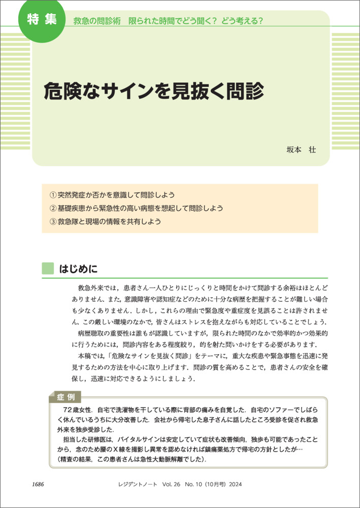 皆さん救急外来の問診(病歴聴取)で困った経験はありますよね.例えば…42歳の女性が咽頭痛を主訴に来院し,新型コロナの迅速検査を施行したところ陽性.それを伝えると,「あ,やっぱり.息子がコロナなので」と言われ,「それ,早く言ってよ〜」と某企業のCMのような台詞が頭のなかで流れたこと,ありますよね.…