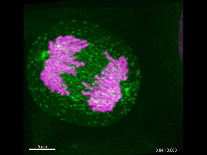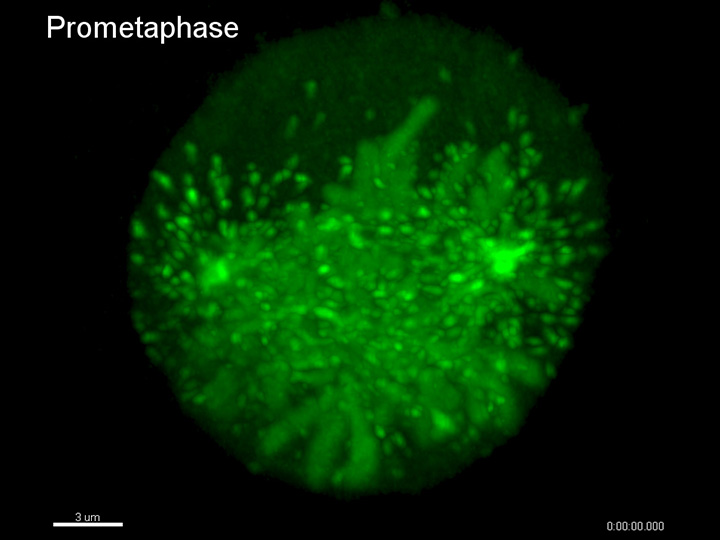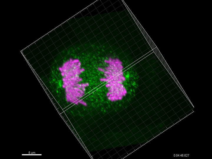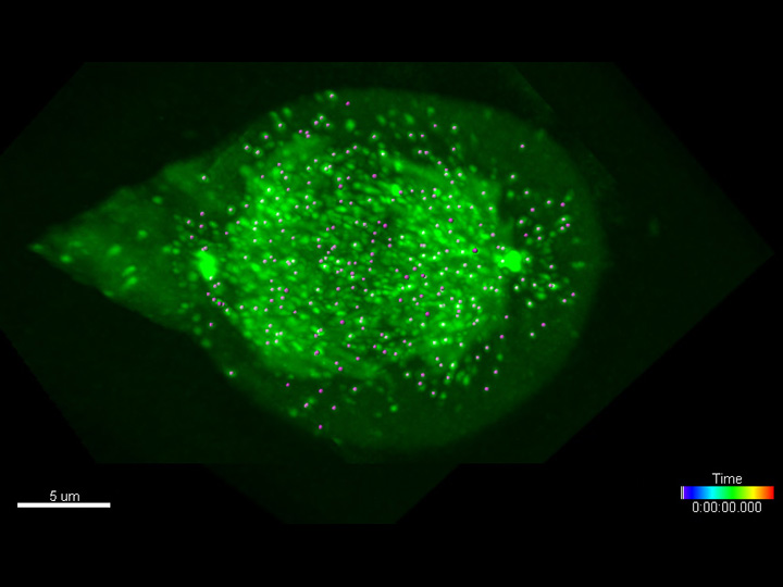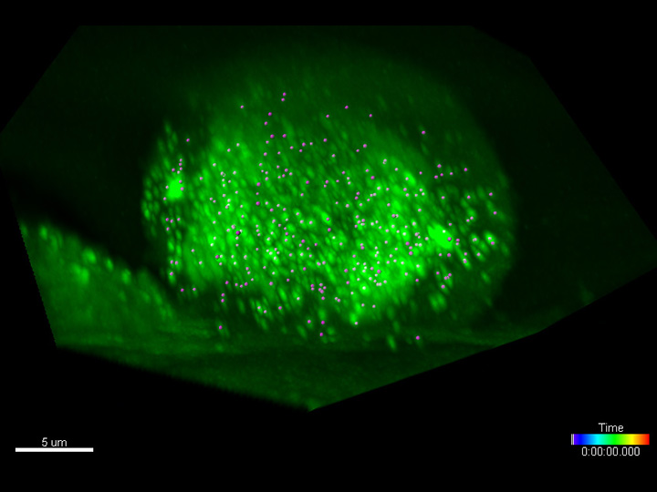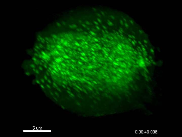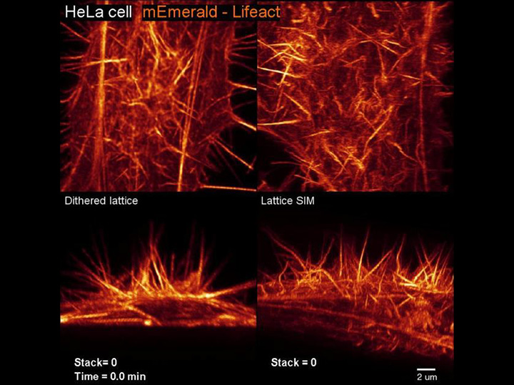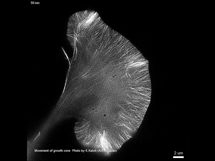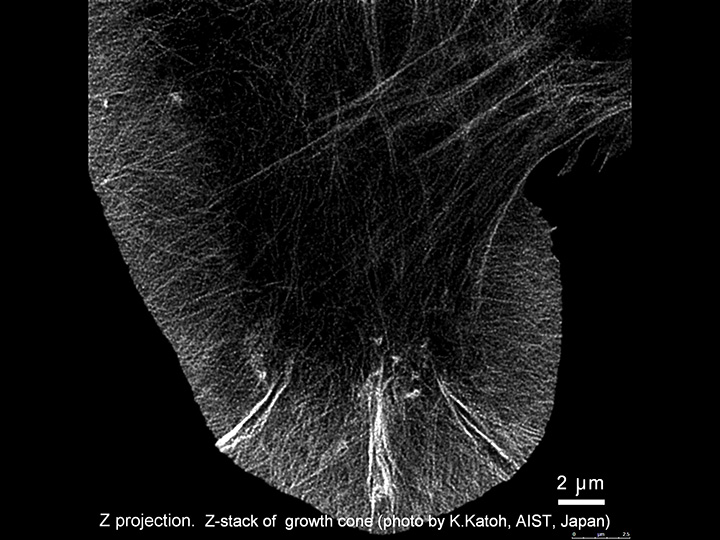 NG108-15細胞の成長円錐を固定し,Alexa Fluor 488ファロイジンで染色したサンプルをSTED 3x (3D STED機能付)で観察した. 140nmの間隔で,Z-stackを撮像した.