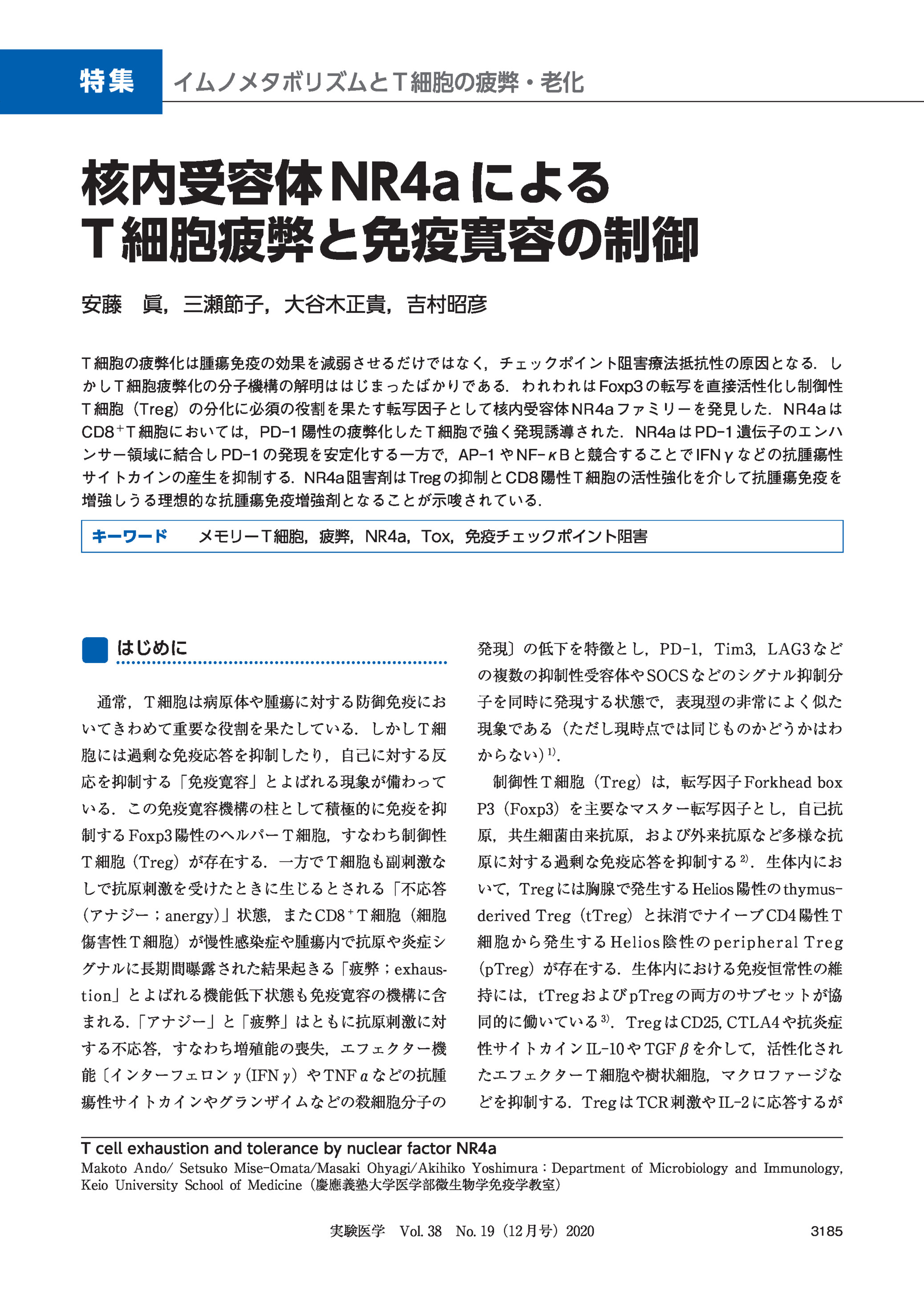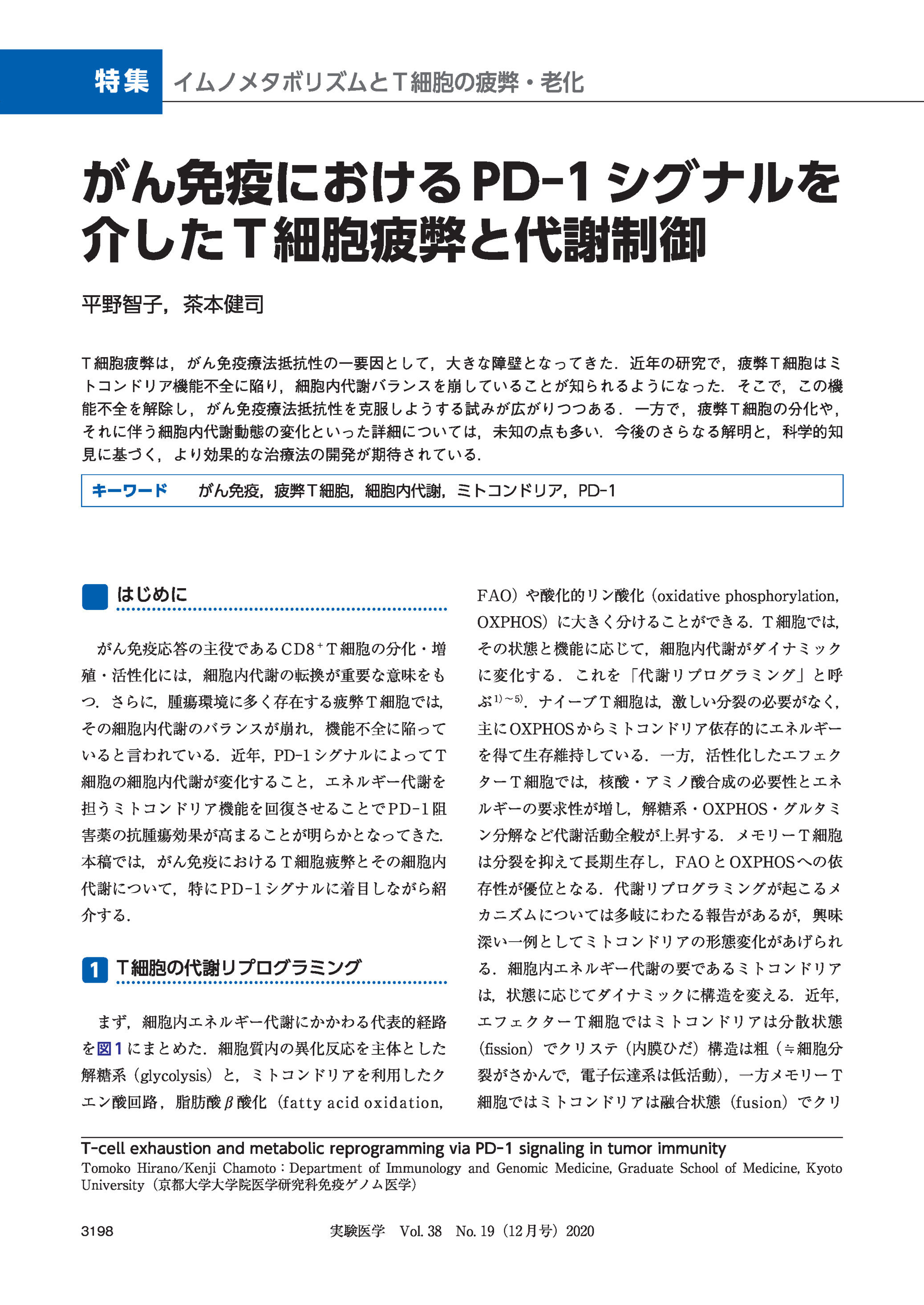 近年,細胞内エネルギー代謝が,エピジェネティック酵素の補因子の供給を介して,細胞の分化や機能を制御していることが明らかとなってきた.T細胞においても,分化や機能が細胞内の代謝状態と密接に関連していることが示されている.本稿では,活性化T細胞におけるグルタミン代謝が,エピジェネティックな機構を介して,加齢関連疾患発症の大きなリスクファクターであるT細胞老化を制御していることを示す.また,グルタミン代謝調節によるT細胞老化の制御が,T細胞養子免疫療法に応用できる可能性についても述べる.