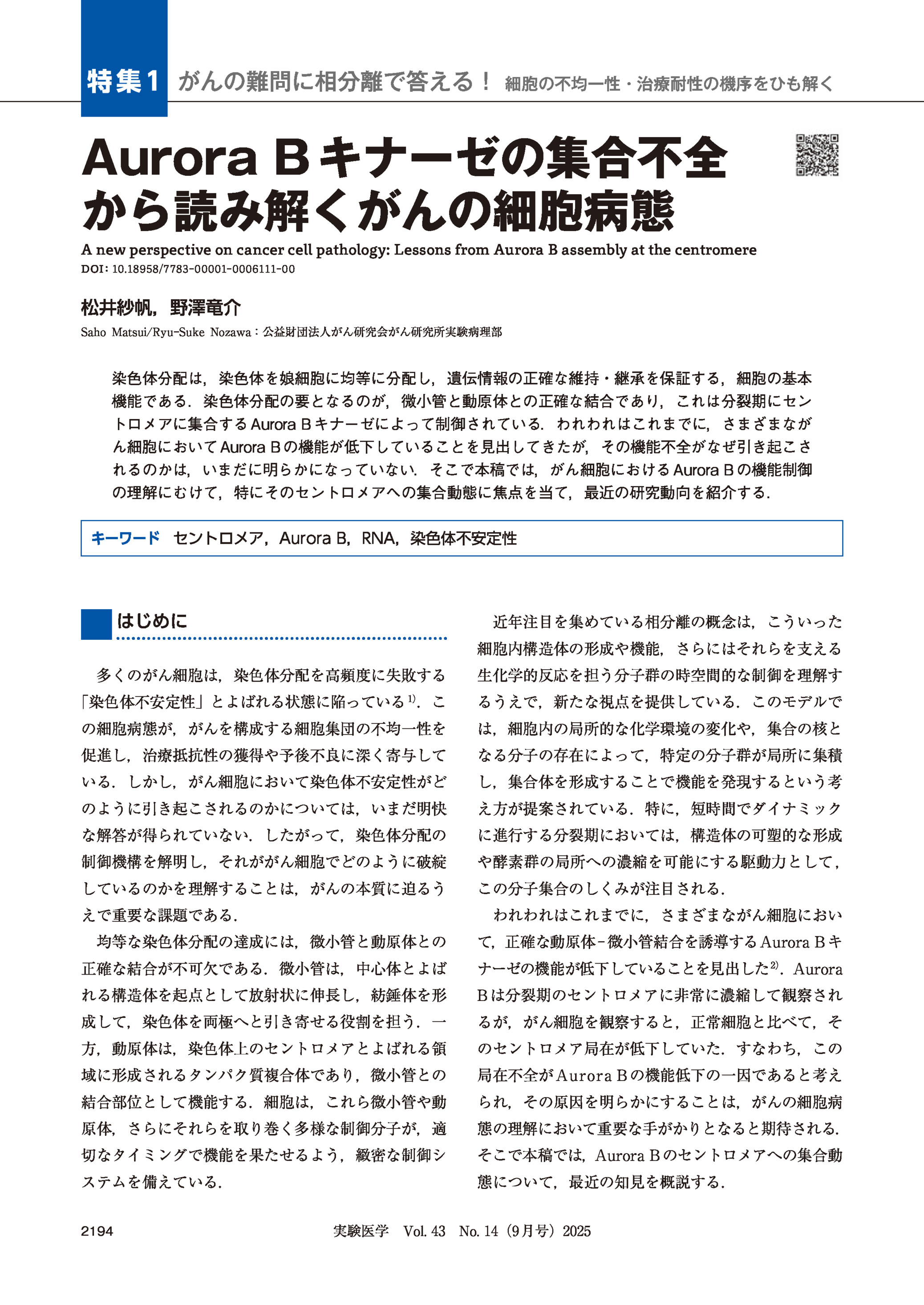 Aurora Bキナーゼの集合不全から読み解くがんの細胞病態 2025年09月号 特集1