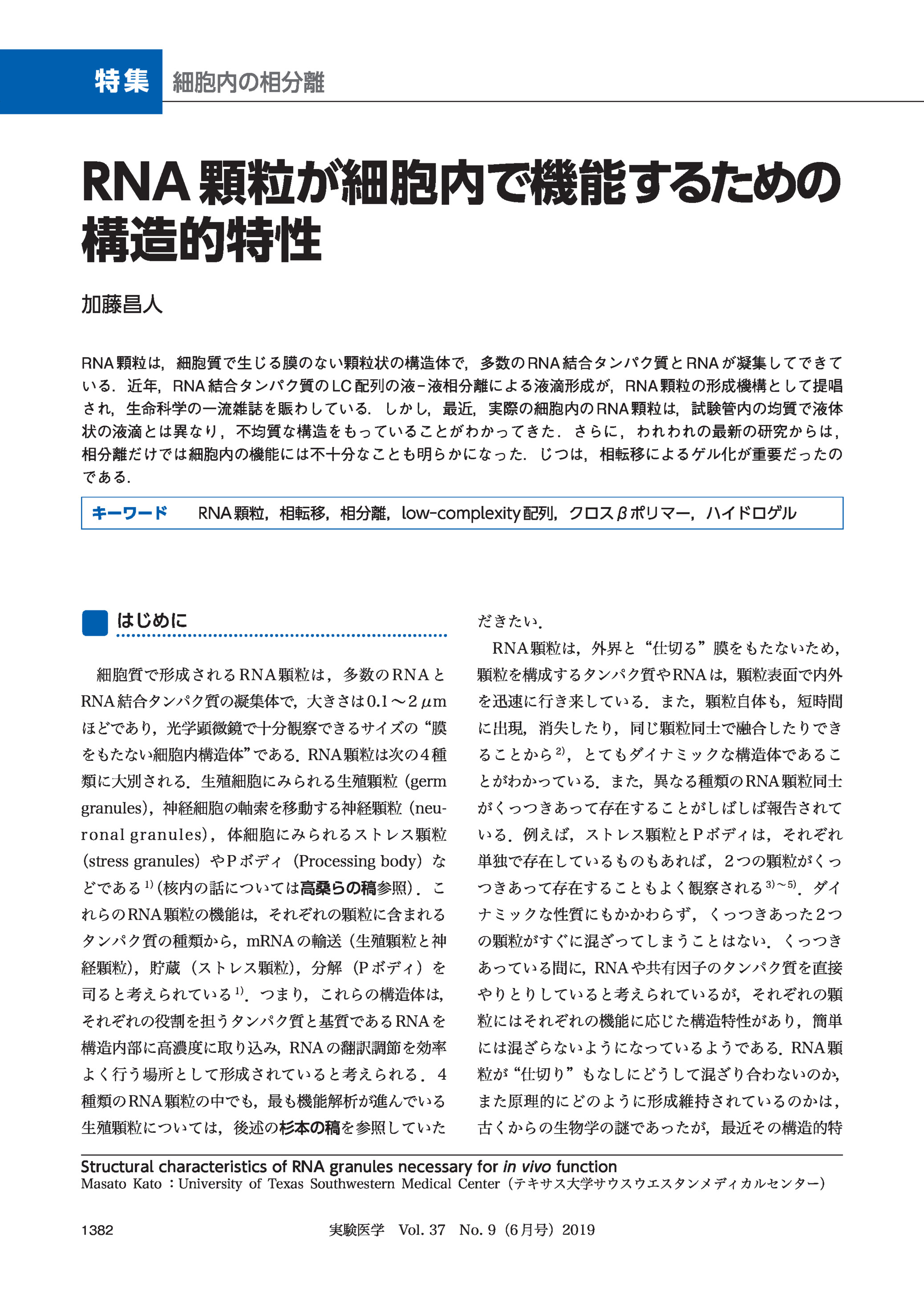 特異的なノンコーディングRNA(ncRNA)が,膜をもたない核内構造体の骨格として働くことが明らかになってきた.本稿では,NEAT1というncRNAを骨格として形成される核内構造体“パラスペックル”に関する最新の研究成果を中心に,タンパク質の相分離を誘導するためのRNAとタンパク質のそれぞれの役割について概説する.また,RNAが単独で相分離を誘導する可能性や,新規な核内構造体とその骨格RNAの探索からみえてきた核内構造体形成機能の一般性について紹介する.