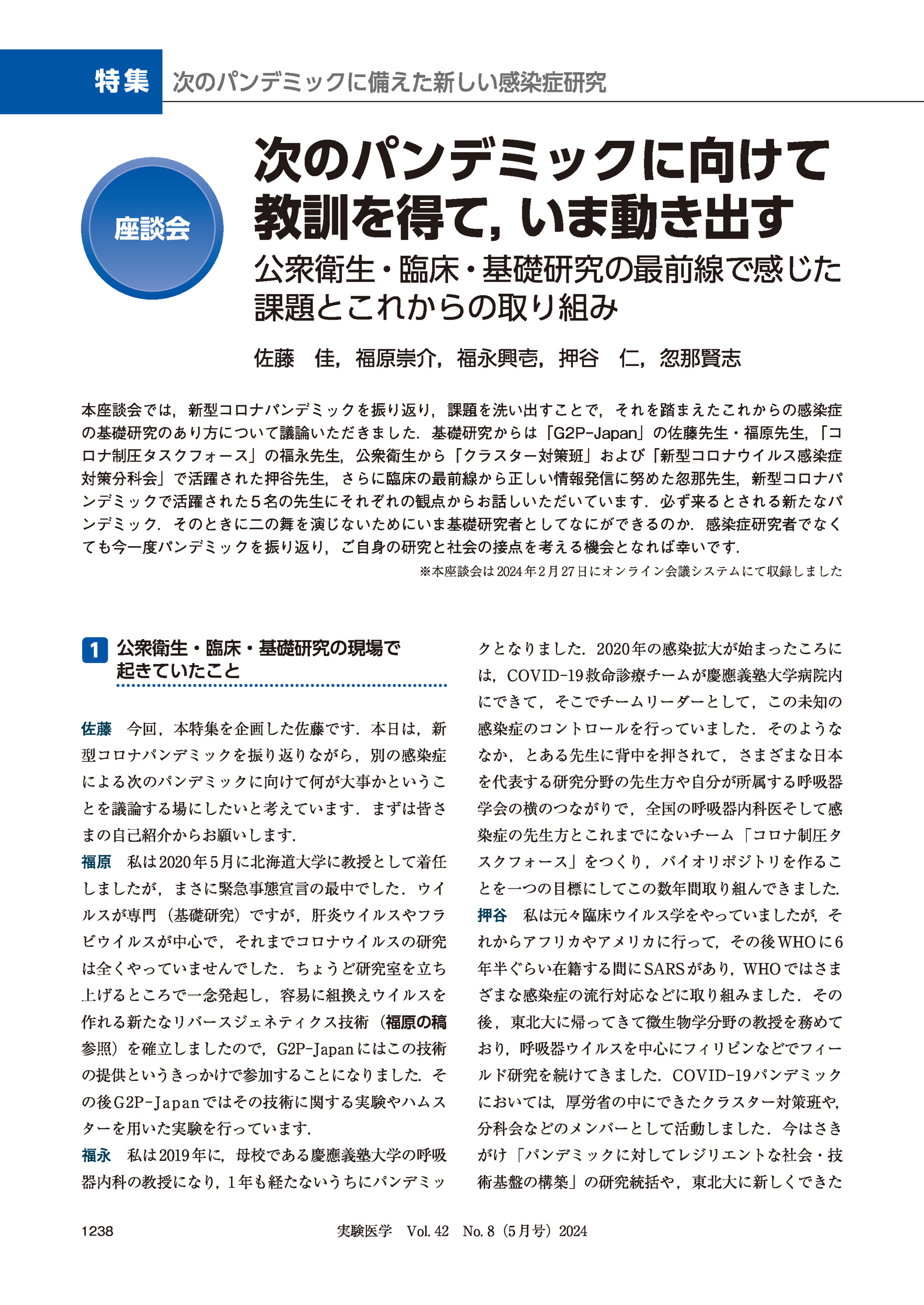 COVID-19パンデミックに基礎研究の立場から対応すべく,G2P-Japanコンソーシアムが立ち上がった.その一員としてわれわれが担ってきたSARS-CoV-2スパイク(S)タンパク質の構造生物学的研究において,次々に出現する変異株にどのように対応し研究を進めてきたかを紹介する.加えてわれわれがCOVID-19パンデミック以前から行っているヒトに病原性を示すウイルスの研究,特に小児呼吸器感染症ウイルス(麻疹・ムンプス・RS)を中心とした感染メカニズム解明のための構造生物学的研究について紹介し,次のパンデミックに備えた研究について構造ウイルス学の観点から言及する.