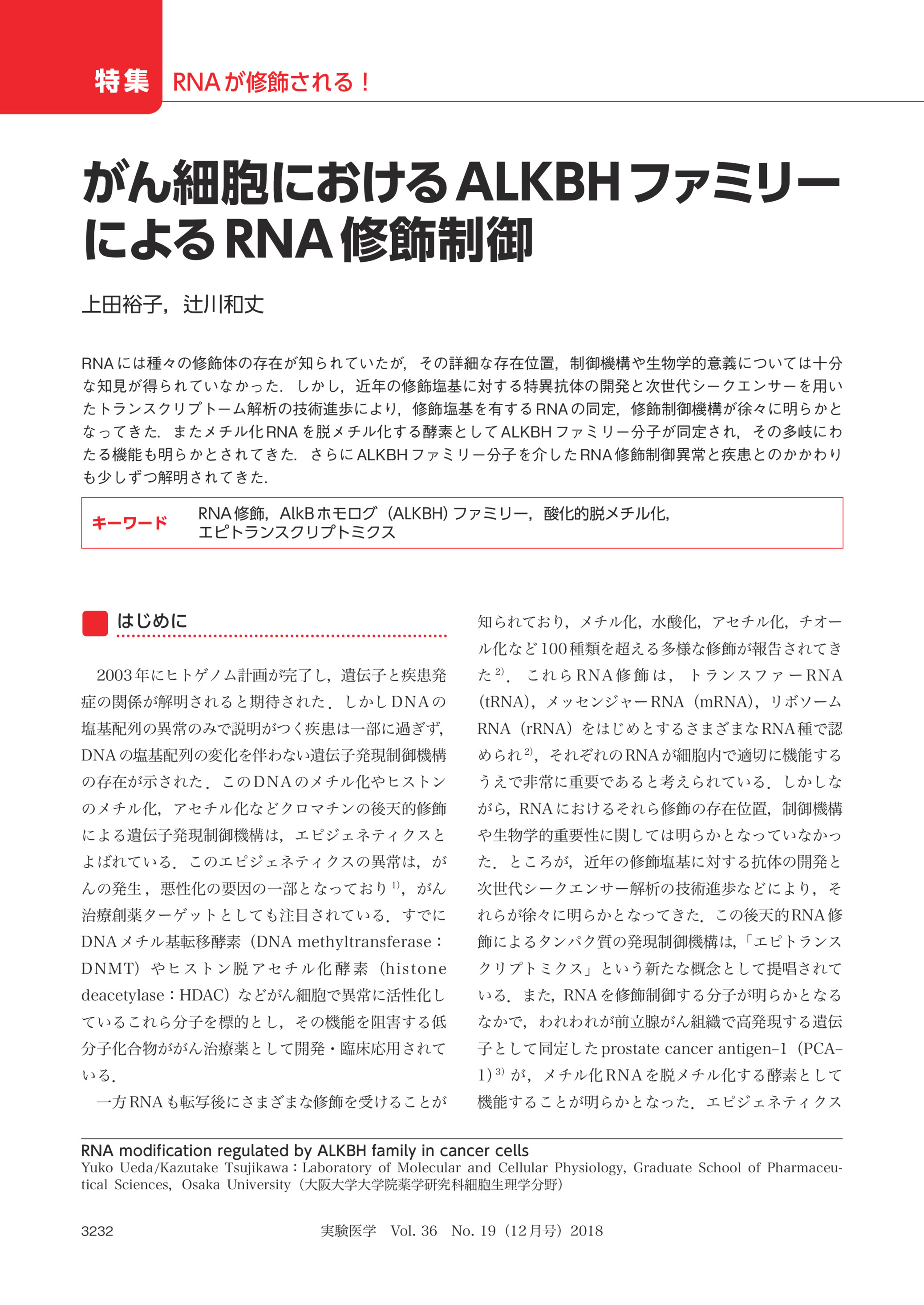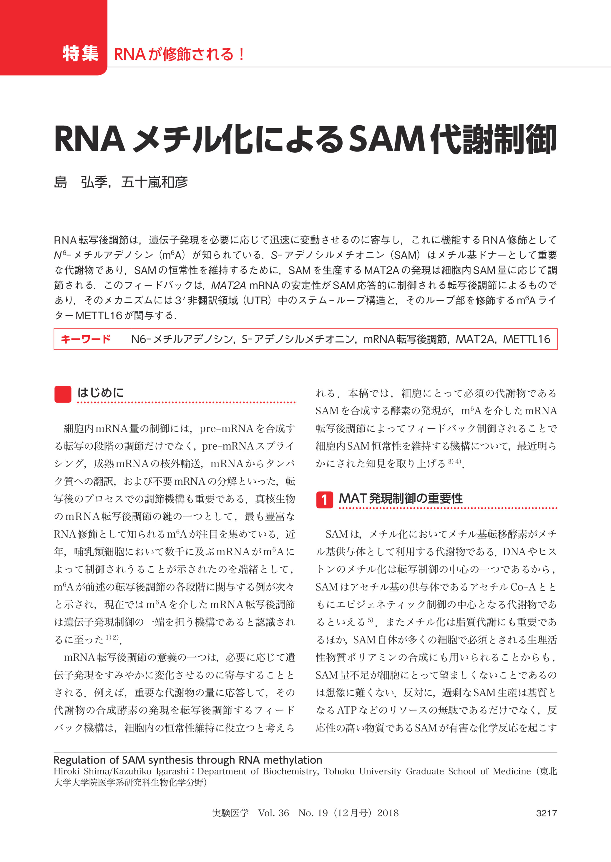 mRNA中のアデノシンのN6メチル化は,細胞分化と発生にきわめて重要な働きをする.しかしなぜ成体組織においても約30%のトランスクリプトームが依然としてメチル化されているのかは不明である.われわれは,概日リズムに関与することが知られているカゼインキナーゼ1デルタ(CK1δ)遺伝子から組織特異的な選択的スプライシングによって生成される2つのアイソフォームの翻訳が,3′非翻訳領域(UTR)のアデノシンのN6位メチル化によって抑制されていることについて明らかにした.