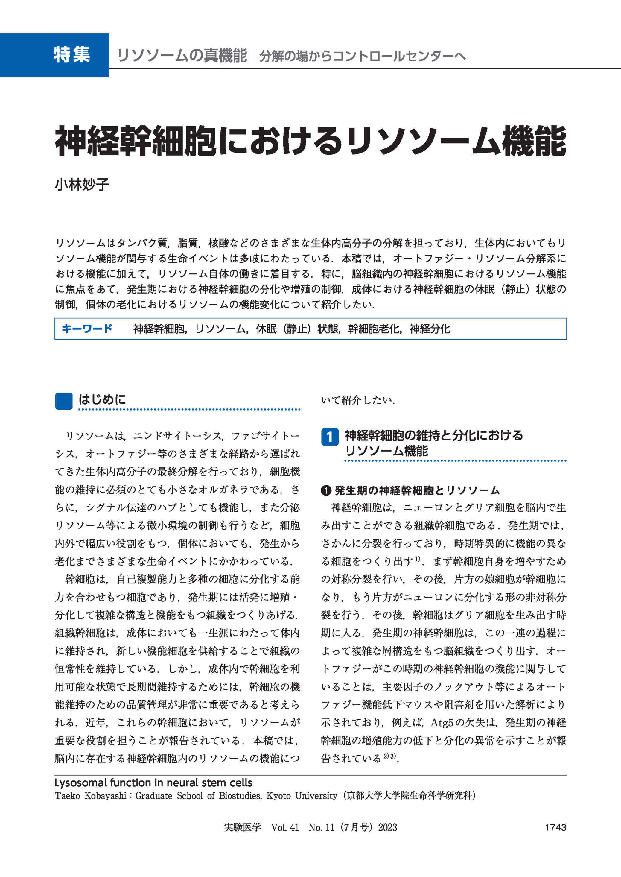 多様な臓器や組織に起こる過剰な慢性炎症は,これら臓器・組織の機能不全を引き起こし,個体老化の大きな原因となる.老化細胞はさまざまな炎症物質を分泌するため(senescence-associated secretory phenotypes,SASP),この加齢に伴う慢性炎症に老化細胞の蓄積が重要な役割を果たしていると考えられている.われわれは,細胞老化に伴いタンパク質凝集体がリソソーム内に蓄積し,リソソーム膜に損傷を誘導して細胞内酸性化を生じていることを見出した.老化細胞は生存するためにGLS1タンパク質によりグルタミン代謝の過程でアンモニアを産生させて中和していると考えられる.この経路を遮断することで老化細胞を個体内から選択的に除去できる可能性が提唱されている.