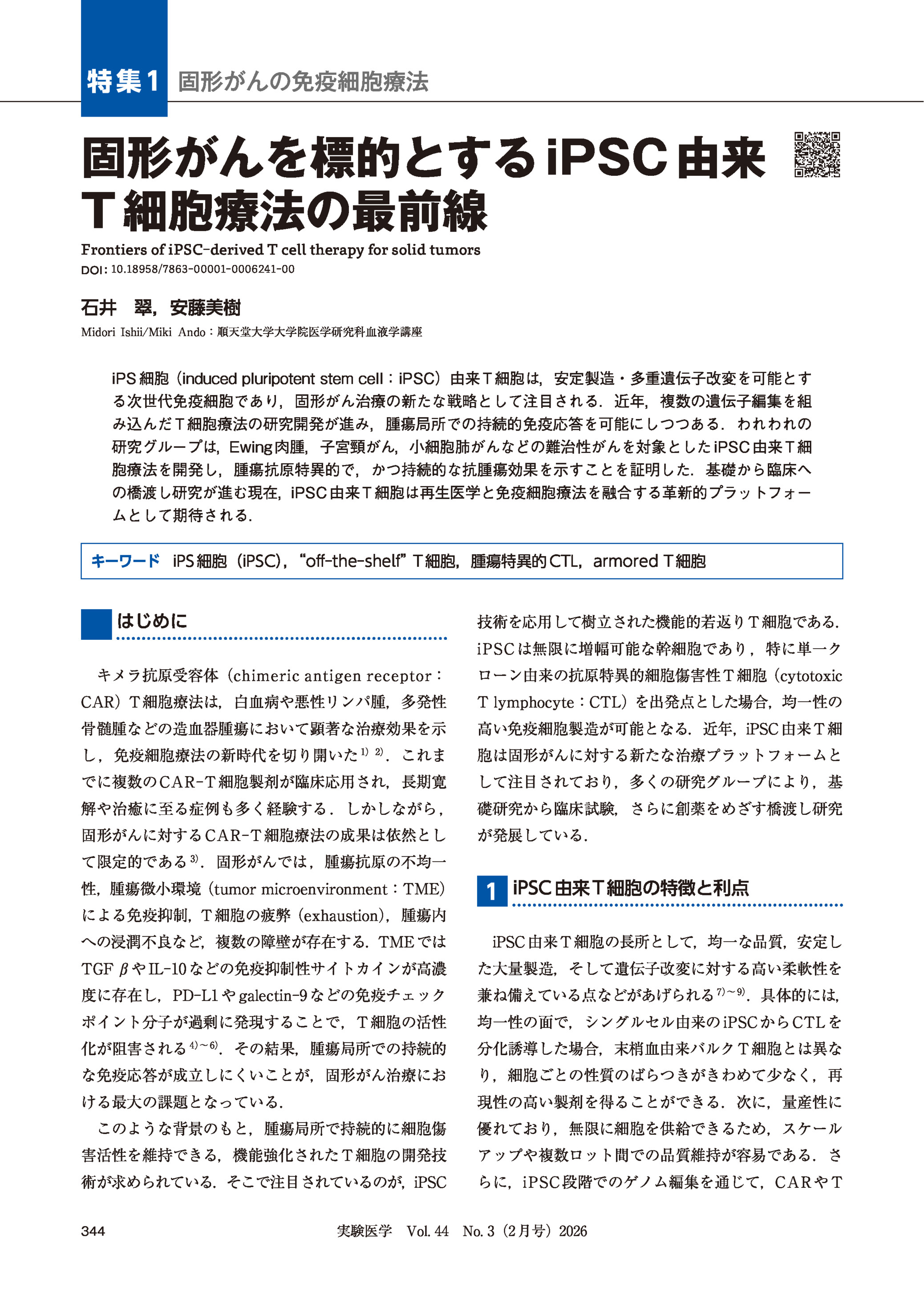 固形がんを標的とするiPSC由来T細胞療法の最前線 2026年02月号 特集1