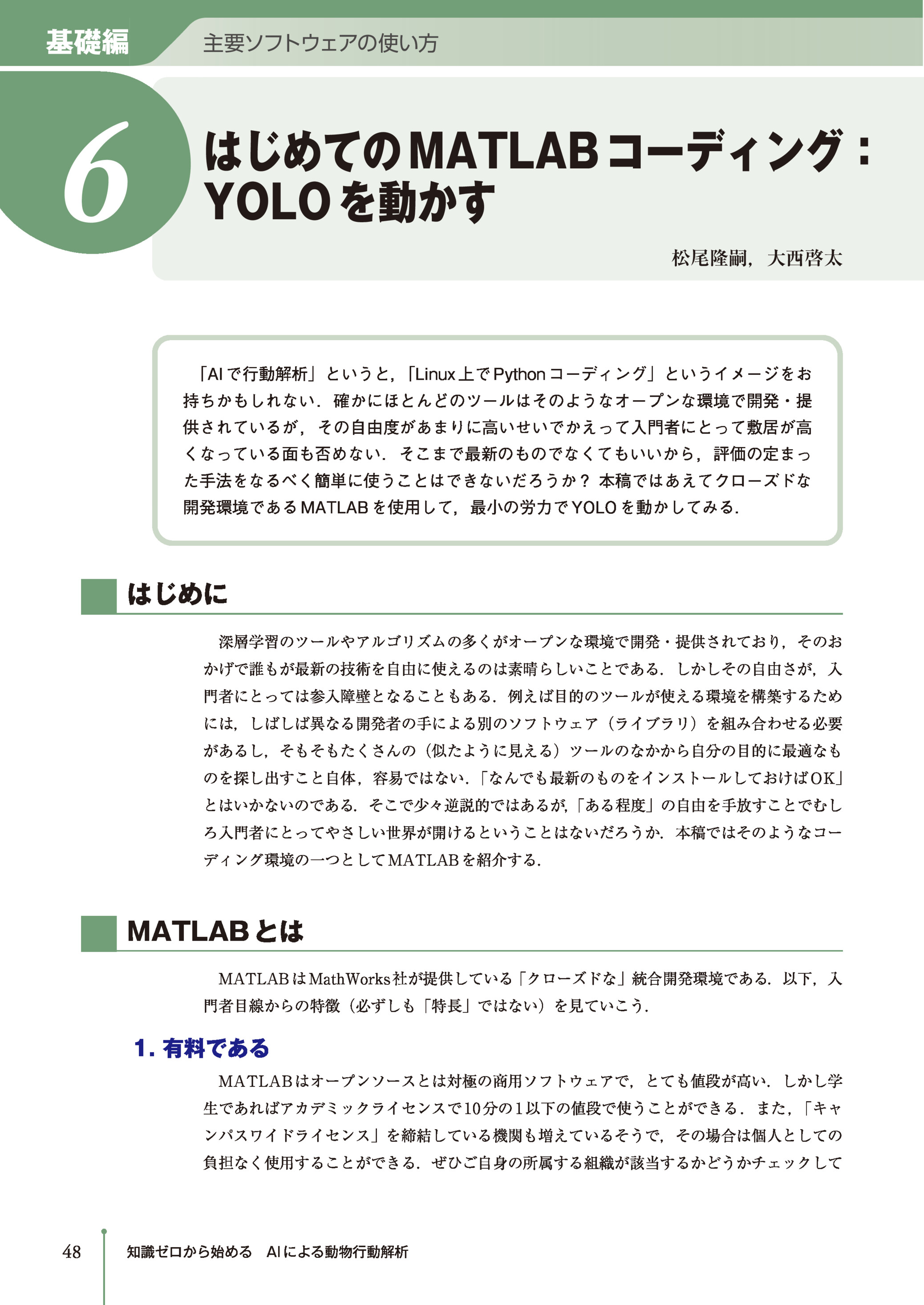 動物行動解析の定量化や自動化が求められるなか,DeepLabCutは,高精度かつ手軽に個体の姿勢推定を実現する革新的なツールとして人気を博している.追跡対象が視認できればラベル付けが可能で,GUI※1も備えているため,専門知識がなくても使用できる点が特に支持されている.転移学習により,どのような動物に対しても,髭などの微細な構造に対しても,最小限のトレーニングデータで対応可能である.近年では,マルチアニマルやリアルタイム解析や3次元トラッキングといったニーズにも対応している.本稿ではDeepLabCutのインストール方法から追跡対象のラベル付け,学習,ラベルを予測した動画を作成するところまでを紹介する.