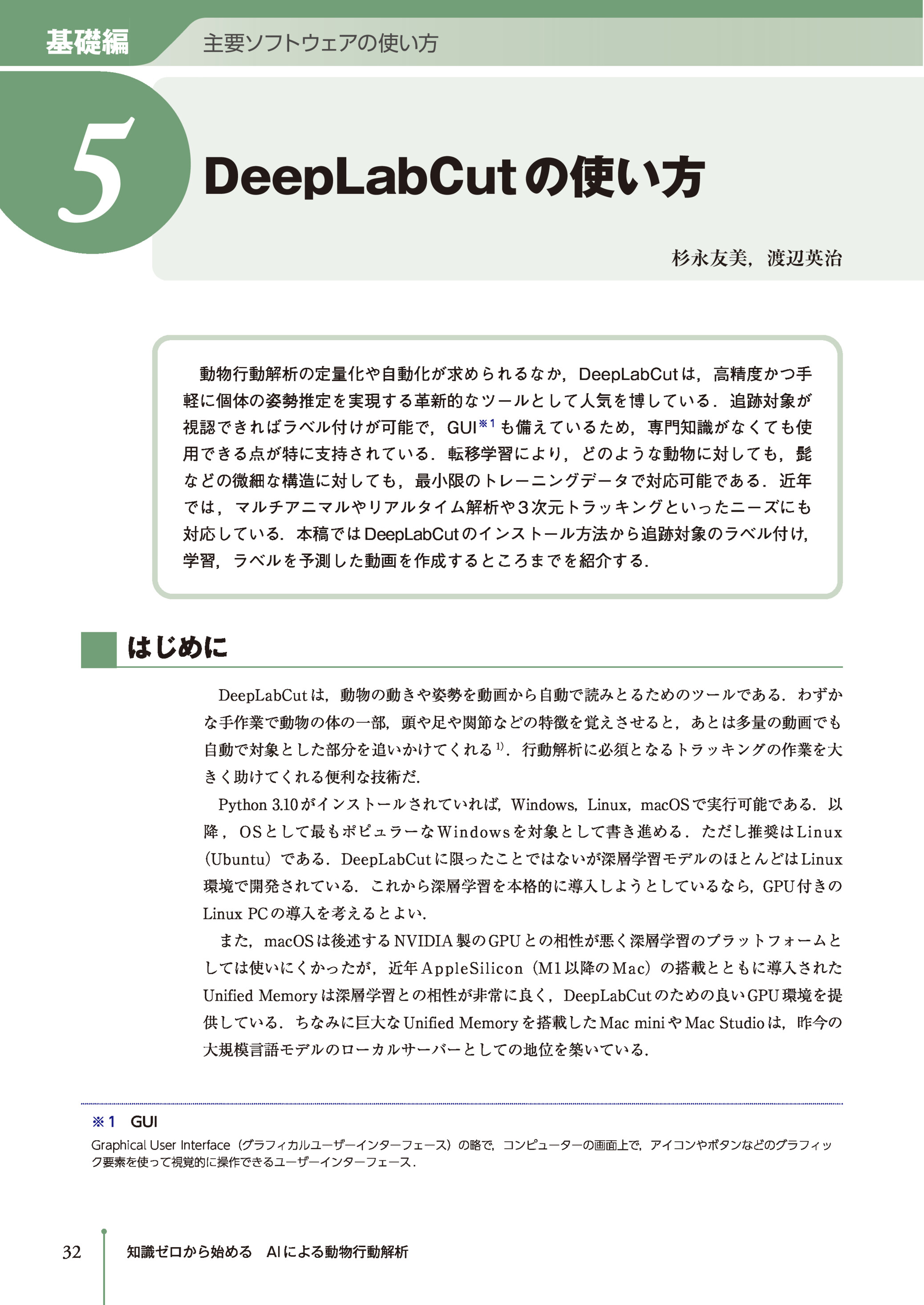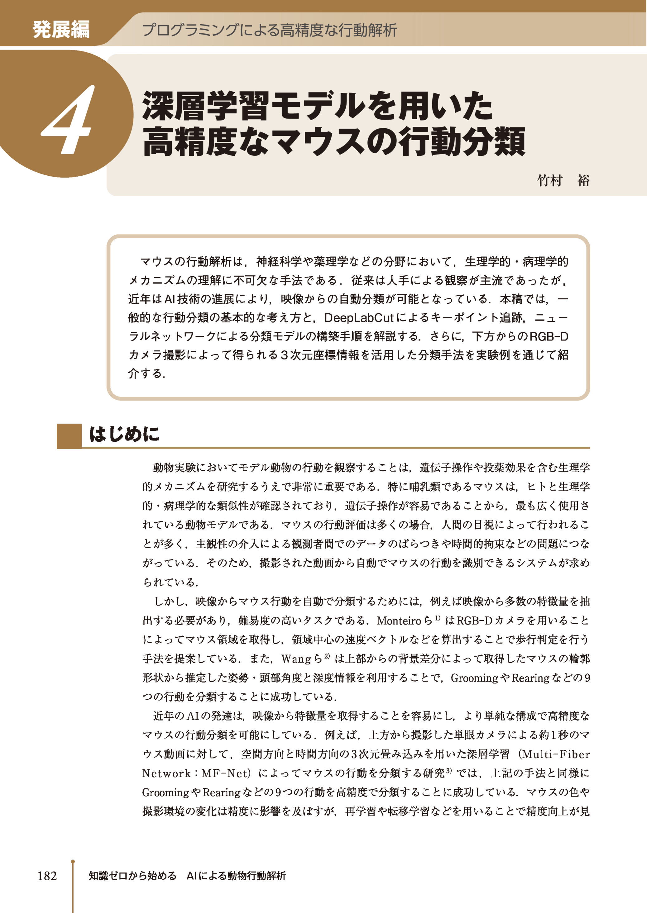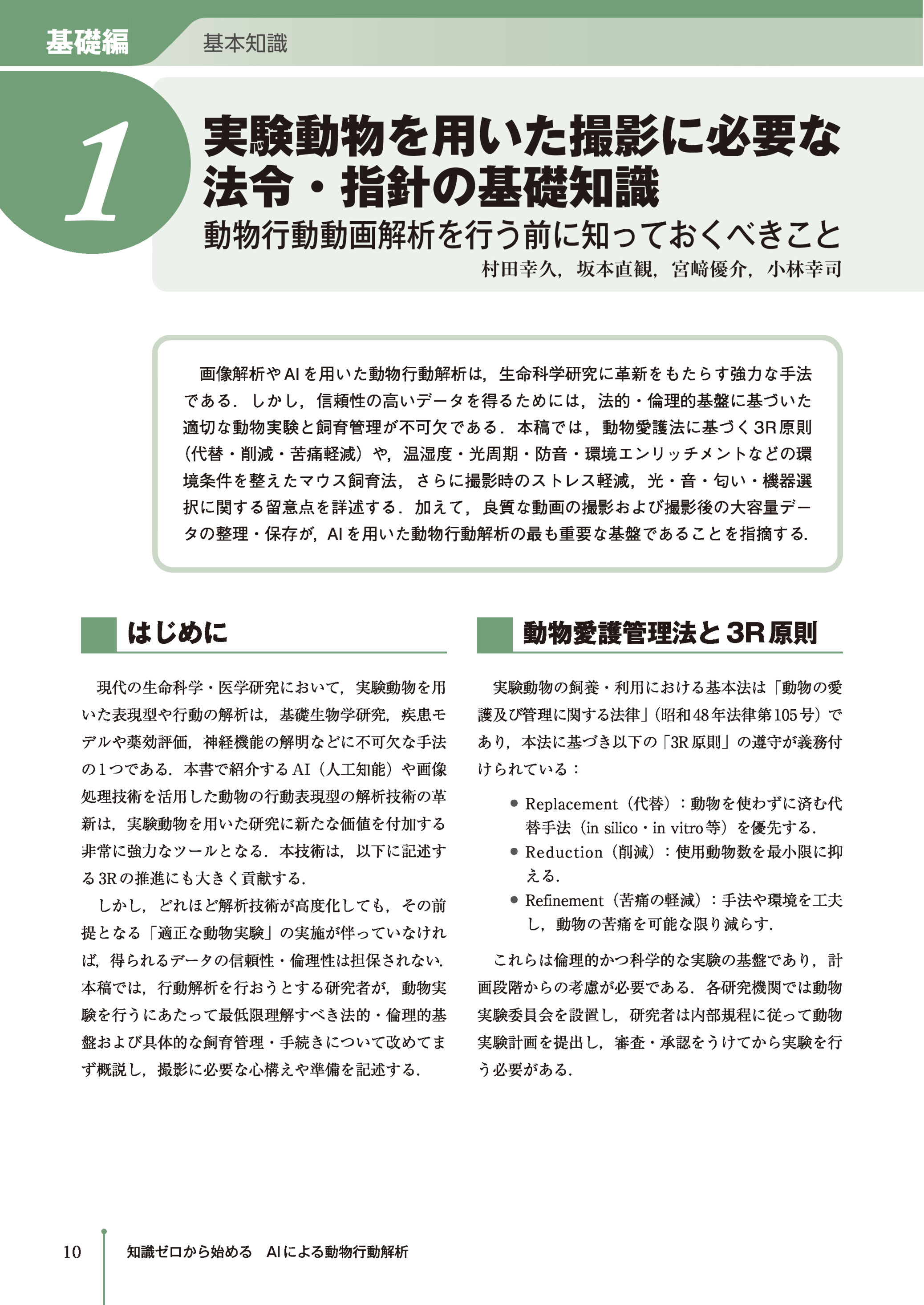 動物の歩行や運動中の関節の動き,軌跡を解析することは,正常な運動制御の理解のみならず,神経・筋疾患や外傷により生じる運動障害の定量的評価,さらに個体間の違いや発達過程,治療介入の効果判定など,幅広い研究において重要な基盤となる.特に速度や加速度,関節間の協調性,力学的負荷といった運動ダイナミクスの側面を含めた解析は,行動の質的変化を捉えるために不可欠である.本稿では,DeepLabCutを用いてラットのトレッドミル歩行を撮影・解析し,前肢の関節角度の時系列変化を算出する一連の手順について,実践的な観点からステップを追って詳述する.