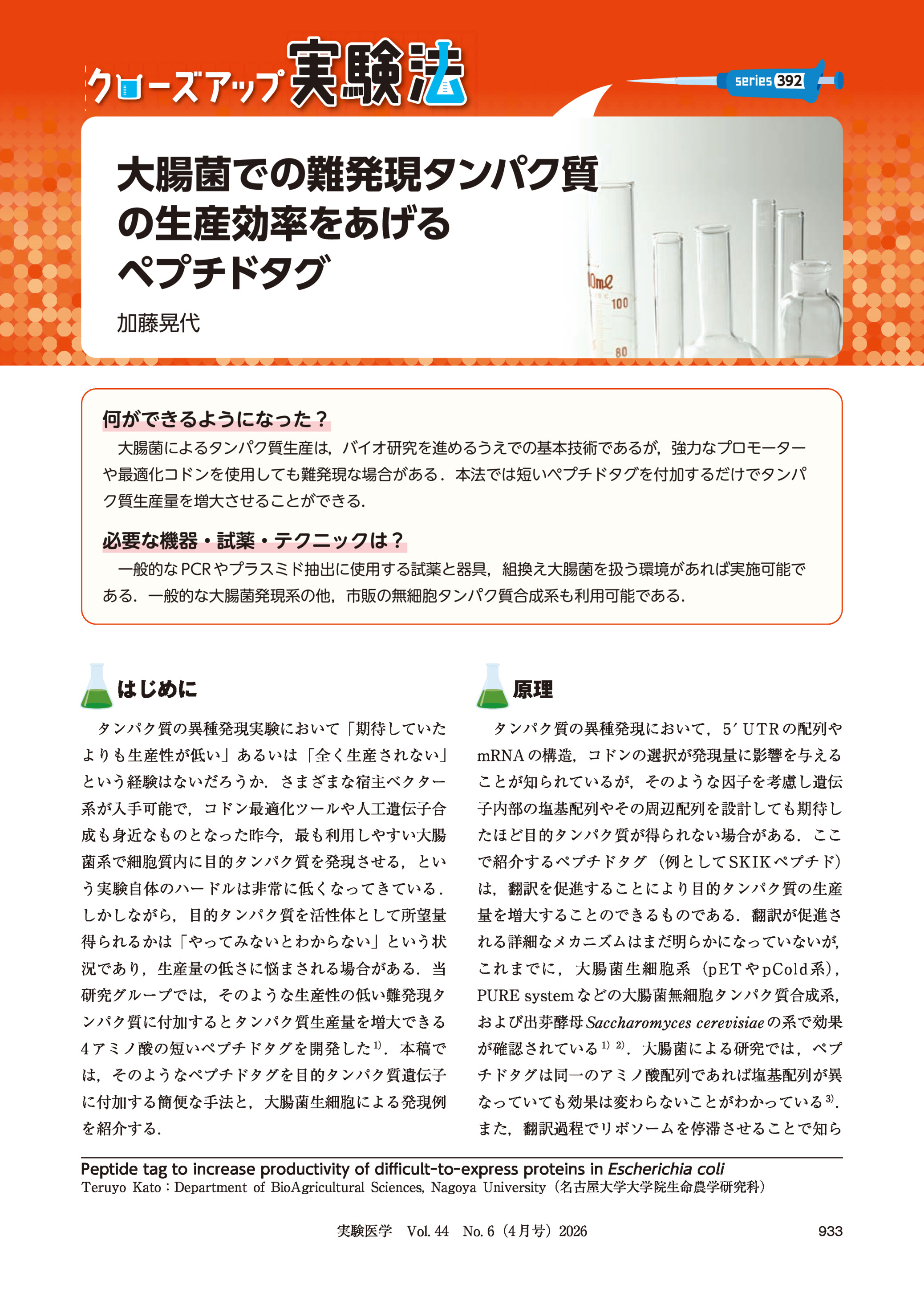大腸菌での難発現タンパク質の生産効率をあげるペプチドタグ 2026年04月号 実験法