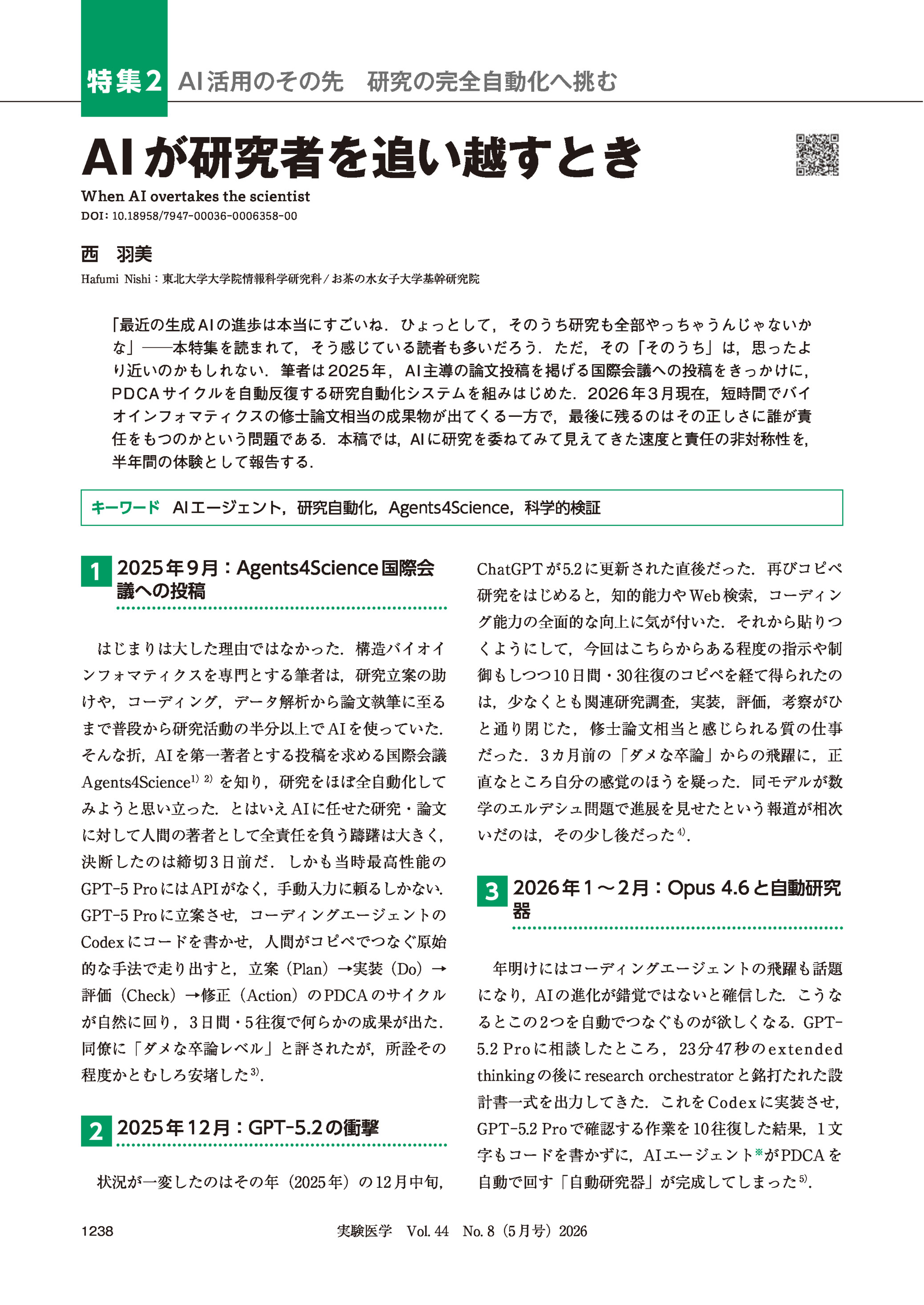 有機化学合成は,創薬研究やケミカルバイオロジーを支える基盤技術として重要な役割を果たしてきた.一方で,その研究プロセスは研究者個人の経験や直感に依存する部分が大きく,反応条件探索や分子設計は試行錯誤を通じて進められてきた.こうした研究様式は高い創造性を生み出す一方で,探索効率や再現性,知識共有の面で課題を抱えている.特に,研究の再現や他研究者による追試が困難である点は,分野横断研究を進めるうえで大きな障壁となってきた.
