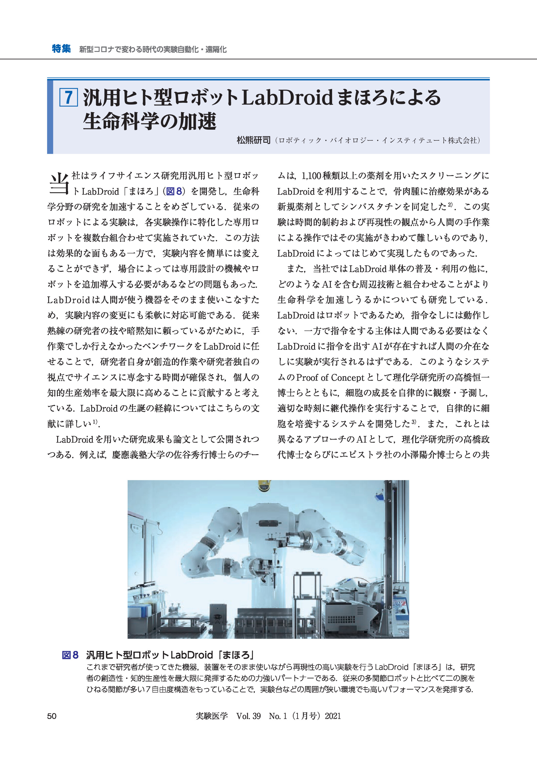 フォーラム:汎用ヒト型ロボットLabDroidまほろによる生命科学の加速実験 自動化・遠隔化と産業 2021年1月号 特集1