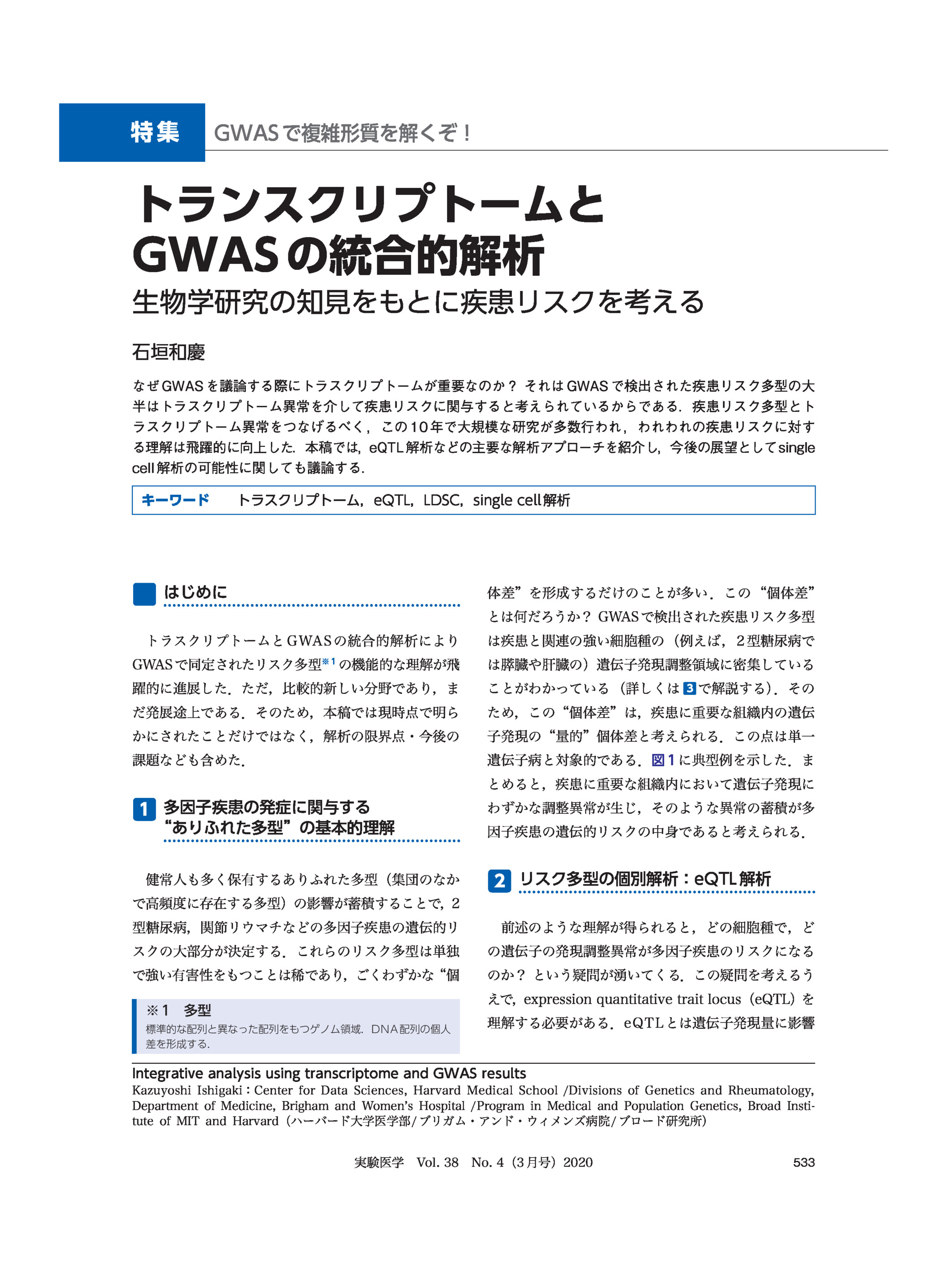 Y染色体喪失は後天的な染色体レベルの体細胞変異で最も頻度の高いものの一つであり,体細胞モザイク(mLOY)を引き起こす.われわれは,バイオバンクジャパンの男性登録者95,380人のDNAデータを解析し,ヨーロッパ系人種でみられるmLOYの加齢や喫煙との関連を確認,未報告の31関連遺伝領域を同定した.遺伝統計学的解析により,造血幹細胞および多能性前駆細胞にシグナルの集積がみられた.さらに,mLOYにおいて重要な役割を果たす転写因子として血小板分化を促進するFLI1を遺伝統計学的に同定,血小板数と赤血球数がmLOYのマーカーとなりうる可能性を示した.