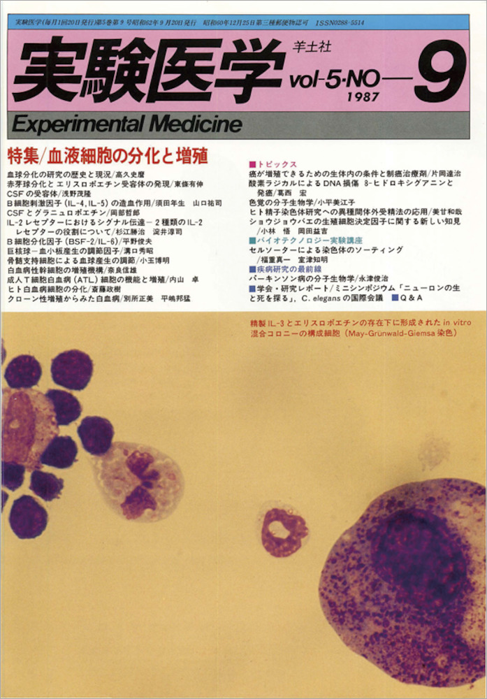 今号では「血液細胞の分化と増殖」というタイトルで,コロニー刺激因子や白血病をめぐる新展開など,血液学の領域における重要な問題を特集としてまとめました.ご企画いただいた高久史麿先生の序文にもありますように,これらの問題は高等動物のあらゆる細胞の問題に関連すると考えられ,この分野のより一層の発展が期待されます.