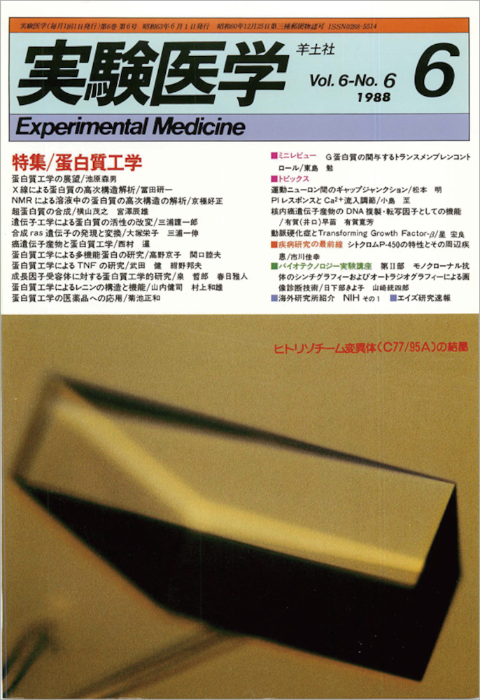 今号の特集「蛋白質工学」は,遺伝子工学を大きな武器として蛋白質を解析,その一部を改変,目的にかなった新しい蛋白質を作リ出そうという技術です.池原森男先生にご企画いただきました.それぞれのレビューには,新しいオリジナルな研究が紹介されており,今後の蛋白質研究の発展が期待されます.