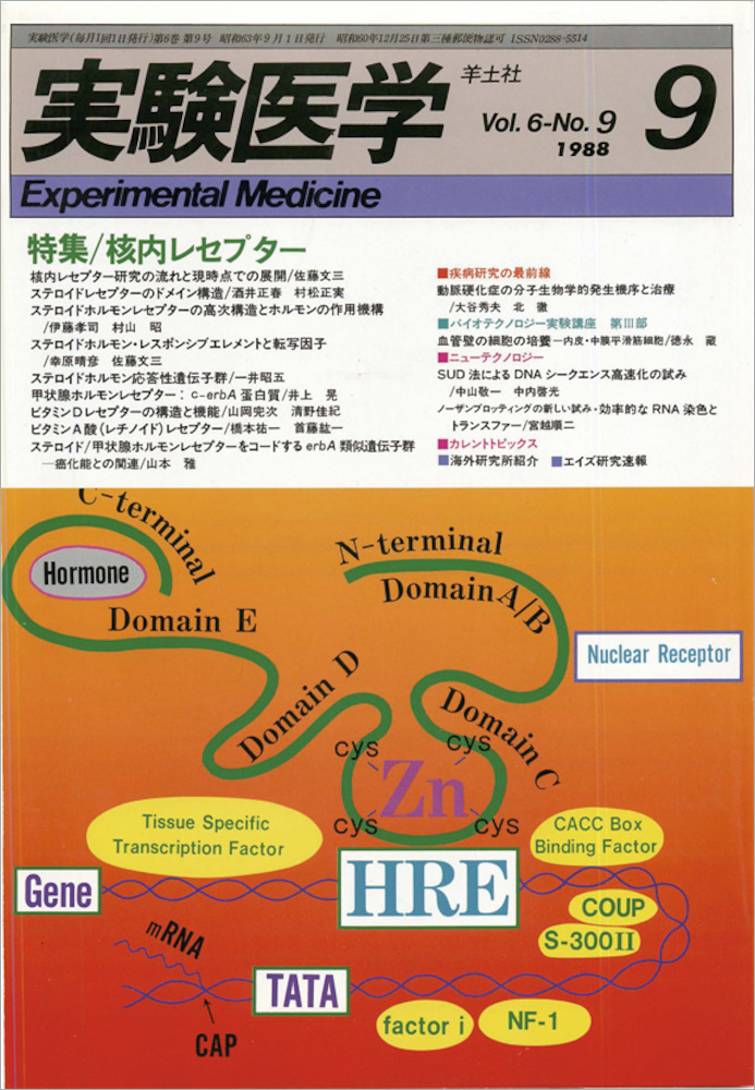 今月は「核内レセプター」と題し,ステロイドホルモンを中心に,細胞内で作用するホルモンレセプターを佐藤文三先生のご企画で特集いたしました.核内レセプターは,発生・分化といった生理的因子あるいは環境因子など,種々の刺激に応答して遺伝子発現を調節する転写制御因子で,その機構の解明が熱心に試みられています.