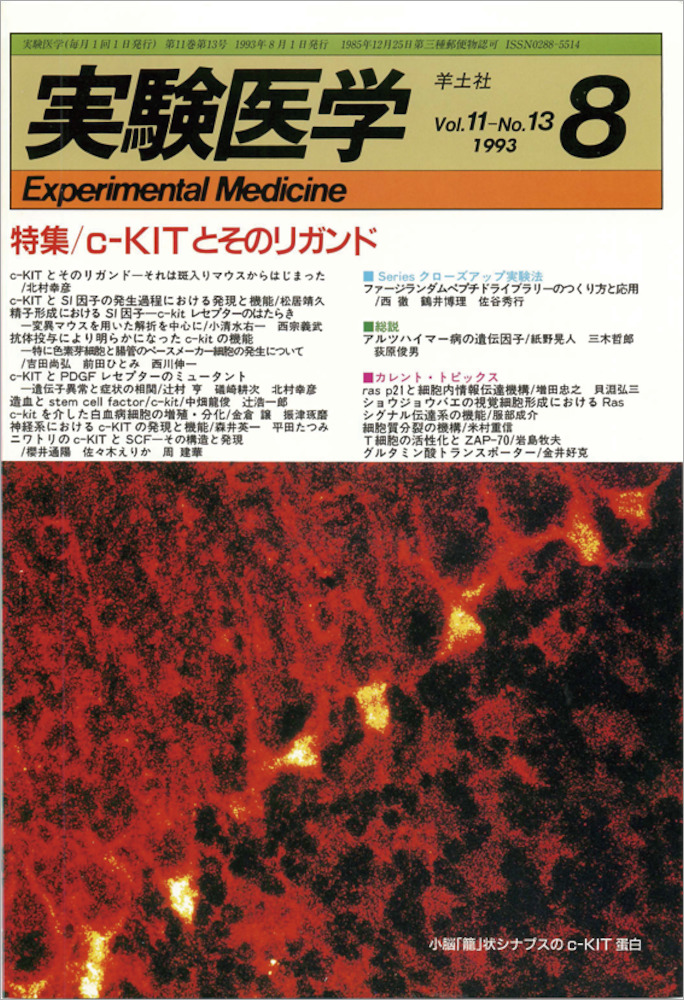 c-KITとそのリガンドであるSl因子やstem cell factorなどは,生殖細胞や血液細胞などの細胞の増殖・分化に重要な役割を果たしています.今号では,そのc-KITとc-KITのリガンドに焦点をあてて,特集いたしました.企画は大阪大学医学部病理学講座の北村幸彦先生にお願いいたしました.