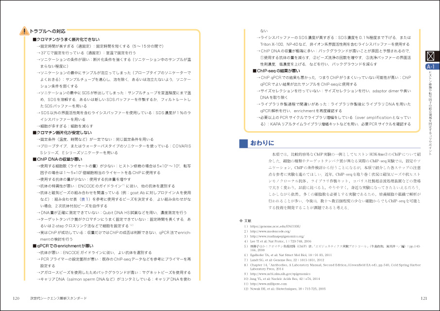 - 現場のニーズに完全に合致した超優良書。詳細な実験プロトコールから、トラブル対応のTips、データ解析結果の解釈でつまずかないよう着目すべきポイントまで、丁寧に書かれている。サイクルの早いNGS解析分野でも長期間手元で活躍する良書である。(門田幸二 [東京大学・大学院農学生命科学研究科])
