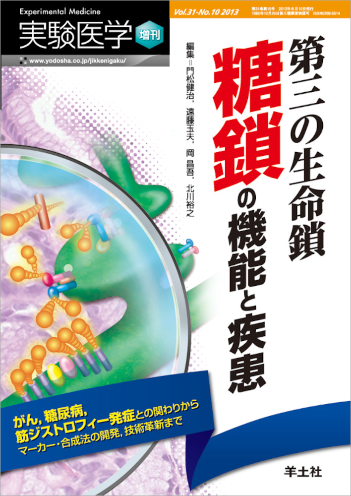 - 【本書名】実験医学増刊:第三の生命鎖 糖鎖の機能と疾患〜がん,糖尿病,筋ジストロフィー発症との関わりからマーカー・合成法の開発,技術革新まで