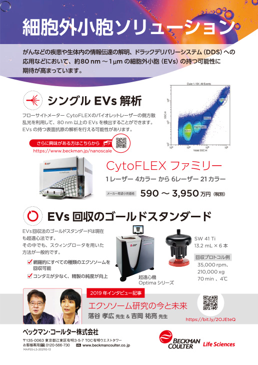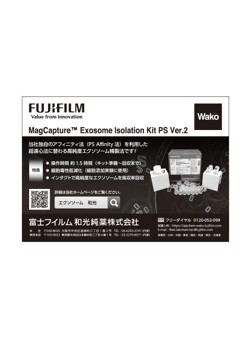 細胞外小胞は,ほぼすべての種類の細胞が分泌する小型(直径50~1,000 nm程度)の膜小胞で,生体液や細胞培養液中に数多く存在している.近年,細胞外小胞に含まれる分子(脂質・タンパク質・RNA・代謝物質など)が他細胞へと受け渡されることで,さまざまな細胞間情報伝達を担うことが判明し,その機能が注目されている.また,これらの分子の発現様式が,細胞の状態や疾患の進展と関連しており,細胞外小胞内のバイオマーカーの探索や細胞外小胞を用いた創薬の開発など,特に応用面において世界的な競争となっている.しかし,細胞外小胞の多様性・機能・解析法の問題など,克服すべき基礎的課題はいまだ山積みである.…