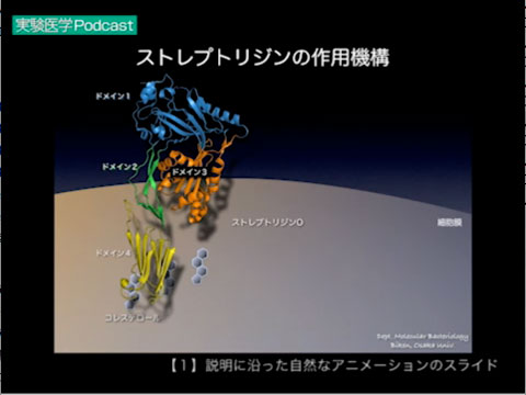 • 説明:動画1のスライドで,適当にランダムにアニメーションを設定してみた.ここでは細胞膜がくるくる回ったり,コレステロールやストレプトリジンが光ったり燃えたり.アニメーションの一つひとつが理解を助けるどころか妨げになっている.