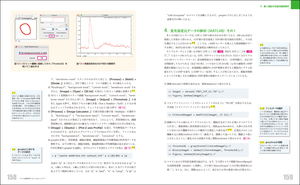さて,ここで重要なのは,バイオイメージングデータをどう定量的・客観的に解析するか,である.イメージング研究は,なまじ「説得力」があり過ぎるため,こういった(地味な)努力は,意外と看過されてきた感が否めない.またイメージング画像の撮り方に関しては指南書がいくつかあるものの,得られた画像をどう解析すればよいのか,答えを引き出せる書物はこれまでほとんどなかった.そういった観点から,本著「バイオ画像解析・手とり足とりガイド」は,まさにこのバイオイメージングのデータ解析法を基礎から実践まで詳細に記述した良書であると言える.
