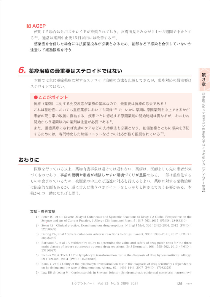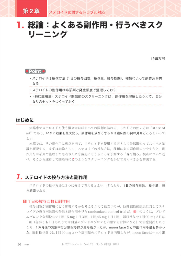 皮膚科疾患の罹患率は非常に高く,皮膚科を専門にせずとも医師は日常的に診療する場面がある.1年目研修医でも入院患者から痒み止めを出してほしいと言われた経験はあるのではないだろうか.ステロイド外用薬は種類も多く,軟膏,クリーム,ローション,スプレー,貼付剤と剤形もさまざまである.どの部位に,どの強さを,どんな頻度で,どのくらい塗るのが適切なのか知識を得ておく必要があるため,ステロイド以外の薬剤も含め本稿で簡潔に解説する.…