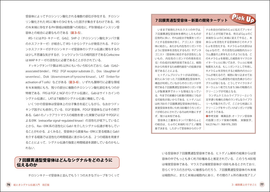 - 細胞内シグナル伝達系の複雑な内容を、極めて平易な文章でわかりやすく解説している。特に筆者自身による挿絵は秀逸である。10セクションに分かれた各項目は、専門分野でない者や、生物科学を志す若い人々の知的好奇心を満足させる内容を含んでいる。 (公立大学准教授)