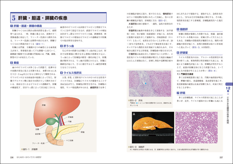 - 肝臓・胆道・膵臓の構造/黄疸/肝うっ血/ウイルス性肝炎/脂肪肝/肝硬変/肝癌/急性膵炎/慢性膵炎/膵癌/胆石症,慢性胆嚢炎