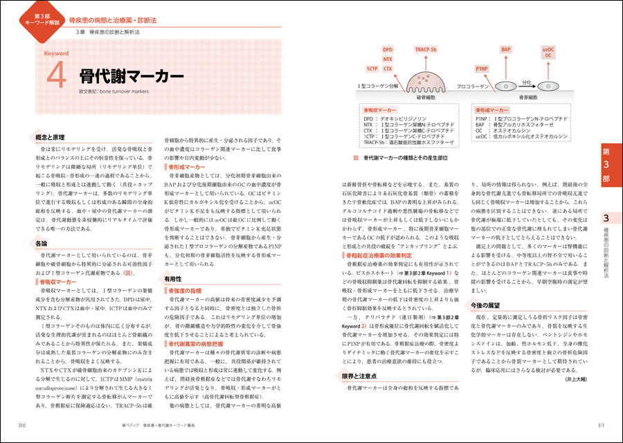 骨粗鬆症,関節リウマチ,骨転移など多岐にわたる骨疾患.これらを基礎から臨床までまるごと理解!骨代謝を司る重要な因子や疾患,治療・診断をキーワードにイラスト入りで簡潔に解説.骨研究の全てが髄までわかる