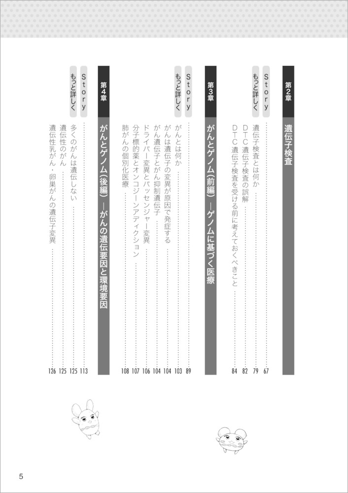 ゲノムの物理量の30億塩基か60億塩基かに触れながら生殖細胞、体細胞、父性、母性由来ゲノム、対立遺伝子の理解やgenome DNAのvariantの概念、それらを読者に伝えた後に、DTCをどう利用するか、その心がまえや結果の捕らえ方、さらに現状で提供されているゲノム解析結果の解釈や、速いスピードのゲノム研究の流れの中で解釈そのものが変わる可能性などにも言及があり、読み手に自ら考えさせる機会を提供できるよう説明されています。