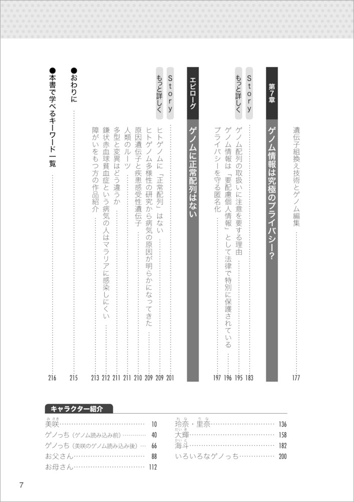 エピローグの中表紙には 「ゲノムに正常配列はない」 という大きな文字のタイトル。実はこの本で著者が最も伝えたかったことでしょうか。最終章では、地球上の誰1人たりとも全く同じゲノム配列であることはない、その事の理解と知識を原点にすることで、人の多様性(個性)、病気や健康、人生まで理解し慮れることを、ゲノっちは熱く語ってくれています。