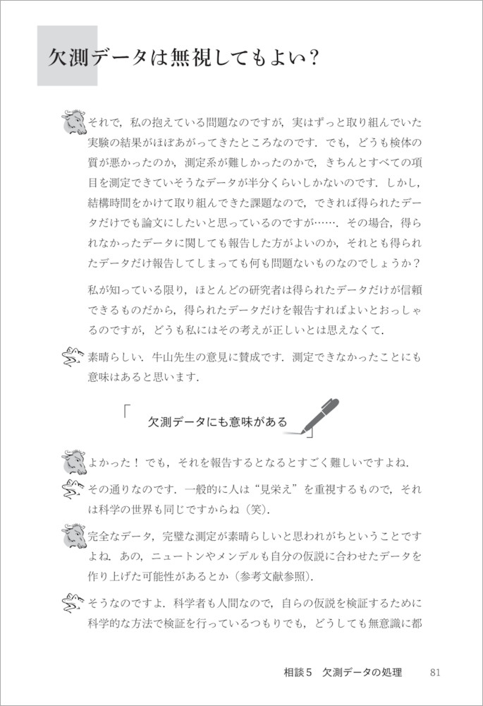 欠測データは無視してもよい?/欠測の原因を探る/欠測を気にすべき場合,しなくてよい場合/データ解析時の欠測データの扱い方/コンサルテーションから共同研究へ