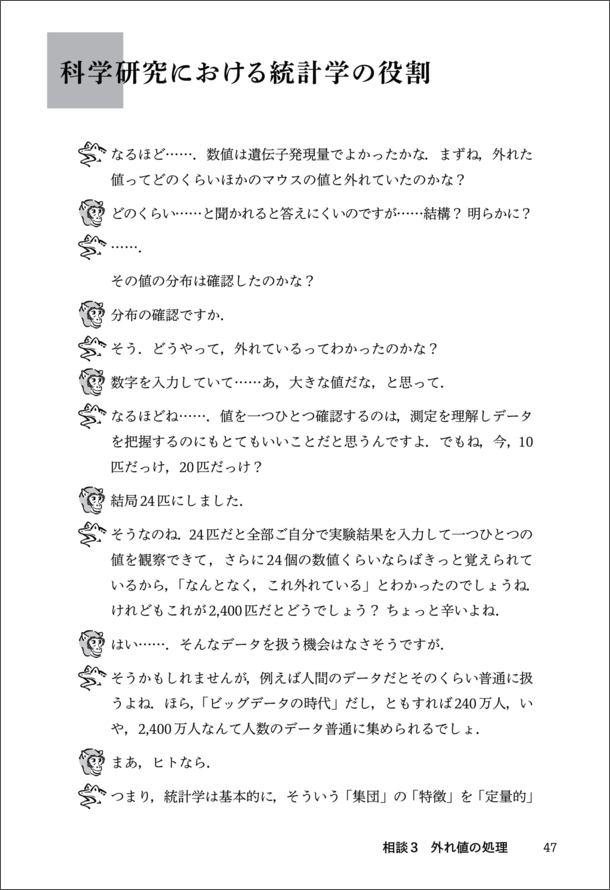 「p値が0.05より大きい」「サンプルが少ない」「外れ値がある」等、統計解析に関するその悩み、専門家に相談してみませんか?11の相談事例を通じて、数式を学ぶより大切な統計学的な考え方が身につきます