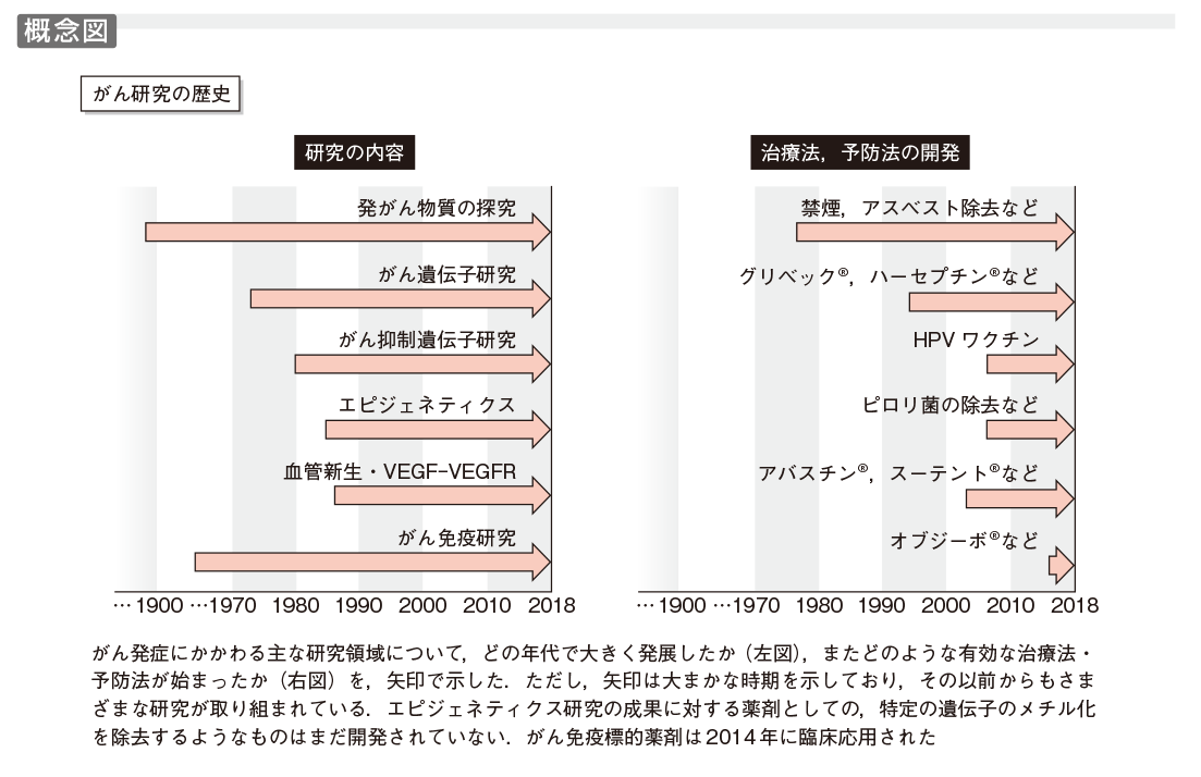 がん研究の歴史全体を正確に網羅することは筆者にとって不可能であるが,この項では上に述べた諸点を中心に概説したい(概念図).