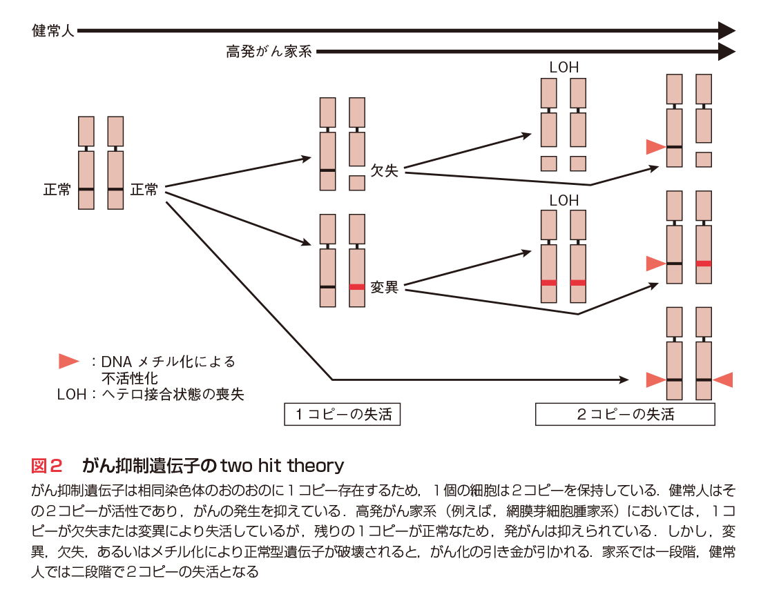 ヒトにおいては網膜芽細胞腫などにおいて高発がん家系が知られていたが,その後,家系調査や疫学調査により,Li-Fraumeni症候群(脳腫瘍,白血病,肉腫など多様ながん),von Hippel Lindau病(腎がん),大腸ポリポージス症(大腸がん),乳がん家系など高発がん家系が見出された.プロトがん遺伝子の異常が遺伝する可能性も考えられたが,1971年,詳細な家系調査をもとに,A. G. Knudsonらは細胞内に2コピーのがん抑制遺伝子が存在し,両方の遺伝子が破壊された場合にがんの発症に至るとのtwo hit theoryを提唱した.その後,遺伝子レベルの多くの解析からこの理論は基本的に正しいことが立証された.すなわち,高発がん家系においては,特定のがん抑制遺伝子の1コピーがDNA欠失や変異で不活性化され,その不活性遺伝子が遺伝的に伝えられる.細胞は残った正常ながん抑制遺伝子の働きにより発がんに至らないが,その正常機能をもつがん抑制遺伝子が何らかの原因により破壊(発現停止)された場合,発がんの重要な段階が踏み出される(第2章-4〜7,第3章参照).このように,高発がん家系は特定のがん抑制遺伝子を同定する貴重な情報を提供した.また,このことは同定されたがん抑制遺伝子は家系に属さない一般の健常人の細胞ががん化する際にも,2コピーの不活性化を介して関与しうることを強く示唆している(図2).以上の研究を背景に,RB,p53,VHL,APC,PTENなど多くのがん抑制遺伝子が見出された(表1).