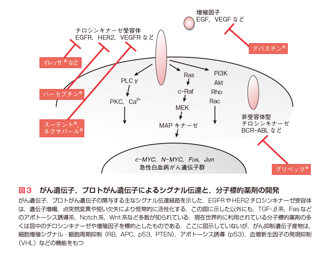 v-ErbBがん遺伝子は,EGFR(EGF受容体)遺伝子の活性化変異であることがJ. Schlessingerらにより示され,また,EGFR遺伝子は悪性膠芽腫において,正常型や活性化変異型などが高頻度で遺伝子増幅していることが報告された.さらに,EGFR関連HER2/c-erbB2/neu遺伝子は乳がんでしばしば遺伝子増幅し5),KRAS遺伝子は膵がんの90%近く,肺がんなどでも高率に活性化変異を生じることが示された6).