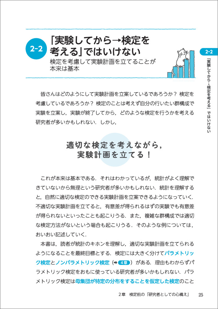 「実践的な統計が身につく」と評判の書籍が7年ぶりに改訂,決定版として登場!検定法の理解に必須な基本がするっとわかります.実験後に検定法を考えている,SDとSEの使い分けが不安…という研究者は必読です!