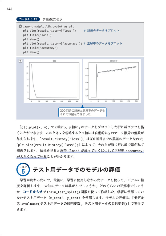 STEP ① データの用意 ② 学習用データでの学習 ③ 損失と重みの更新 ④ 結果の確認 ⑤ テスト用データでのモデルの評価