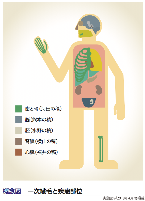 一次繊毛は細胞のアンテナとして機能する(概念図).検出の対象は組織によって異なるが,成長因子,ホルモン,神経ペプチドなどの生化学的な要素から,光,温度,重力,ずり応力などの物理的な要素までと多岐にわたる6).例えば,脳においてはHh(ヘッジホッグ)リガンドやニューロペプチドを検知することで,神経幹細胞や神経細胞の分化,増殖,移動などを制御する(熊本の稿).発生期の心臓では,心拍由来の液体の流れやHhリガンドや増殖因子などを検知することで,心臓の形態形成にかかわっている(福井の稿).ノードとよばれる胚の一部では,周囲の動繊毛が引き起こす液体の流れを感知することで,体の左右軸の決定に重要な役割を担う(水野の稿).また腎臓の管腔においては,原尿が流れることによるずり応力を検知し,細胞分裂軸の決定をする(横山の稿).網膜の桿体細胞の外節は一次繊毛が極度に分化したものだが,ロドプシンを介して光子を知覚する.また歯や骨といった硬組織においても一次繊毛は重要な機能を有する.骨や歯では,Hhリガンドや増殖因子に加えて機械的な刺激を検知するメカノセンサーとしてはたらくことで,軟骨組織や歯牙組織を形つくる細胞の配置を制御している(河田の稿).
