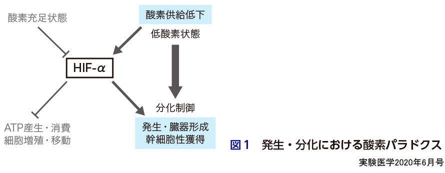 これらの知見も含め,生物にとって「生命維持に酸素は十分に必要,これらの欠乏は悪」であることが長く当然の事実とされてきた.しかし近年の酸素の生物学研究の成果から,これらのドグマ的な考えに矛盾する状況「酸素パラドクス」の存在が示されてきた(発生・分化における例を図1に示す).具体的には,①低酸素を好む細胞,必要な状況があること,②酸素環境は「単純ではなく」「動的に変化し」「クロストークする」こと,そして③HIFの活性化や酸素のセンシングを制御する新たな分子が存在する,といった知見である.本特集では,前半5つの各論で,それぞれの専門分野でこれらの知見をもたらしてきた研究者たちが低酸素とその感知応答機構が臓器機能で果たす役割について紹介する.