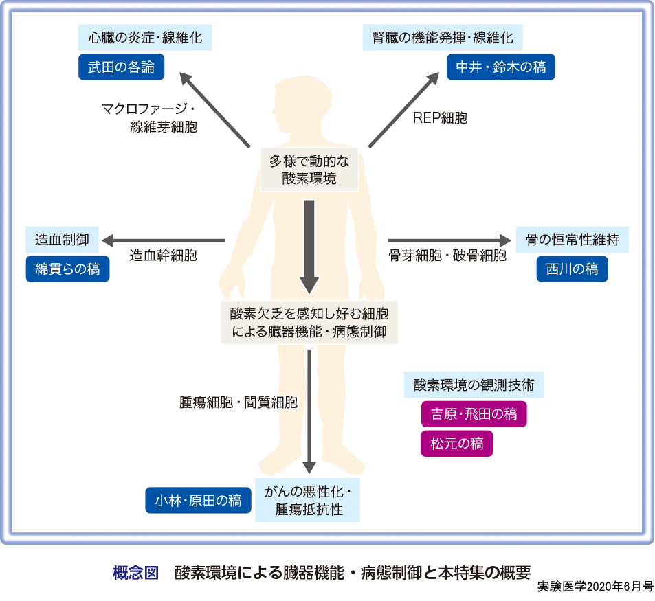 酸素は必要であるが過剰になると酸化ストレスを生じ,細胞傷害活性を発揮して,その結果細胞死や老化,発がんを誘導する.例えば,骨髄の造血幹細胞は酸化ストレスに脆弱で,過剰な酸化ストレスの負荷が幹細胞エイジングにつながることが知られている4).実際,骨髄の造血幹細胞の維持には低酸素環境が必要であることが示された(綿貫らの稿).また,骨の発生や恒常性維持においても低酸素応答が必要である(西川の稿).これらの例にとどまらず,時期や状況に応じて酸素が欠乏した極限環境を必要とする細胞・臓器が存在する.発生期を例にとると,神経からの赤血球産生シグナル誘導に生理的低酸素応答が必要であることが報告されており(中井・鈴木の稿),病的な状況においても悪性腫瘍組織内や,炎症時のマクロファージ遊走,心臓の線維化では低酸素応答機構が病態の形成に寄与する(武田の各論,小林・原田の稿).さらに,慢性腎不全におけるEPO産生低下に起因する腎性貧血においては,腎臓の低酸素応答がうまく機能しないことが一因であることが知られている.現在,PHD阻害剤によるEPO発現の活性化が新たな治療法となることが示された(中井・鈴木の稿).
